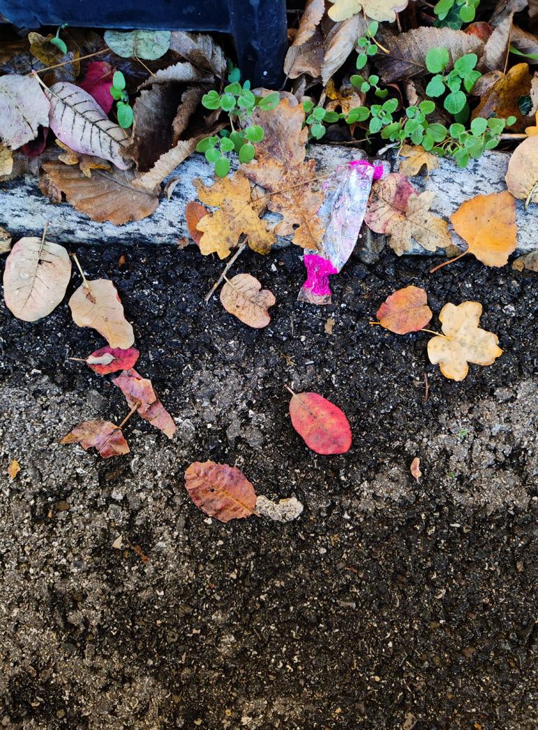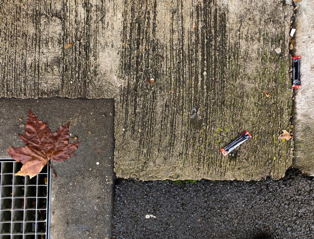 Cependant, mon attention s'est portée sur les emballages de bonbons, sur les restes de contenants alimentaires, sur les résidus de fils électriques, sur tous ces tout petits déchets qui se fondent avec l'asphalte, qui se collent à la terre des plates-bandes ou se mélangent avec les feuilles tombées des arbres. Les compositions étaient déjà prêtes, je n'ai fait que les photographier. Et voici les images.