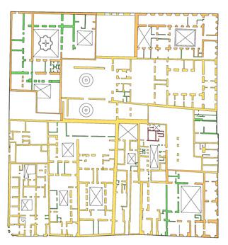 Debido a su conservación en el tiempo, la mayoría de los muros y espacios respetan la tecnología y las tipologías de sus épocas correspondientes: Eentorno a patios centrales o laterales.