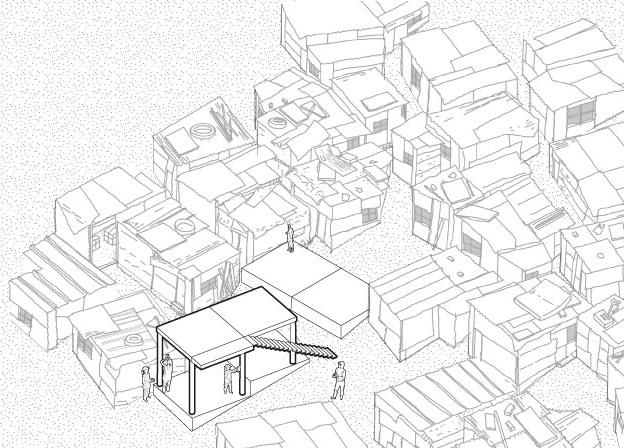 Shacks are demolished to create arteries and reconstruct safer homes. Temporary accommodation in ‘Large Site’ designed to host families during construction process.
