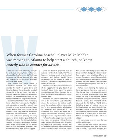 Given the baseball programâs level of success over the last decade, the Vetters have met a steady parade of professional prospects and College World Series participants. But itâs McKee, a native of Arden, N.C., with whom they developed the closest relationship. âOver the years, Mike was so appreciative of the opportunity to play baseball at Carolina,â Steve Vetter says. âHe wasnât the most talented kid on the team. But he loved his role and he participated in a lot of different ways.â The donor and scholarship recipient first met at the annual Rams Club scholarship dinner, the same way the Vetters usually meet the beneficiary of their generosityâ theyâve since also contributed scholarships for volleyball and basketball. It can sometimes be a nervous encounter for a college freshman who is meeting a virtual stranger who has a big stake in their future. McKee, who radiates a permanent warmth that makes him a natural in his profession, never seemed to feel that anxiety. âIt felt like we clicked that same night,â he says. âAnd itâs lasted through today. The initial common ground was that we were all diehard Carolina