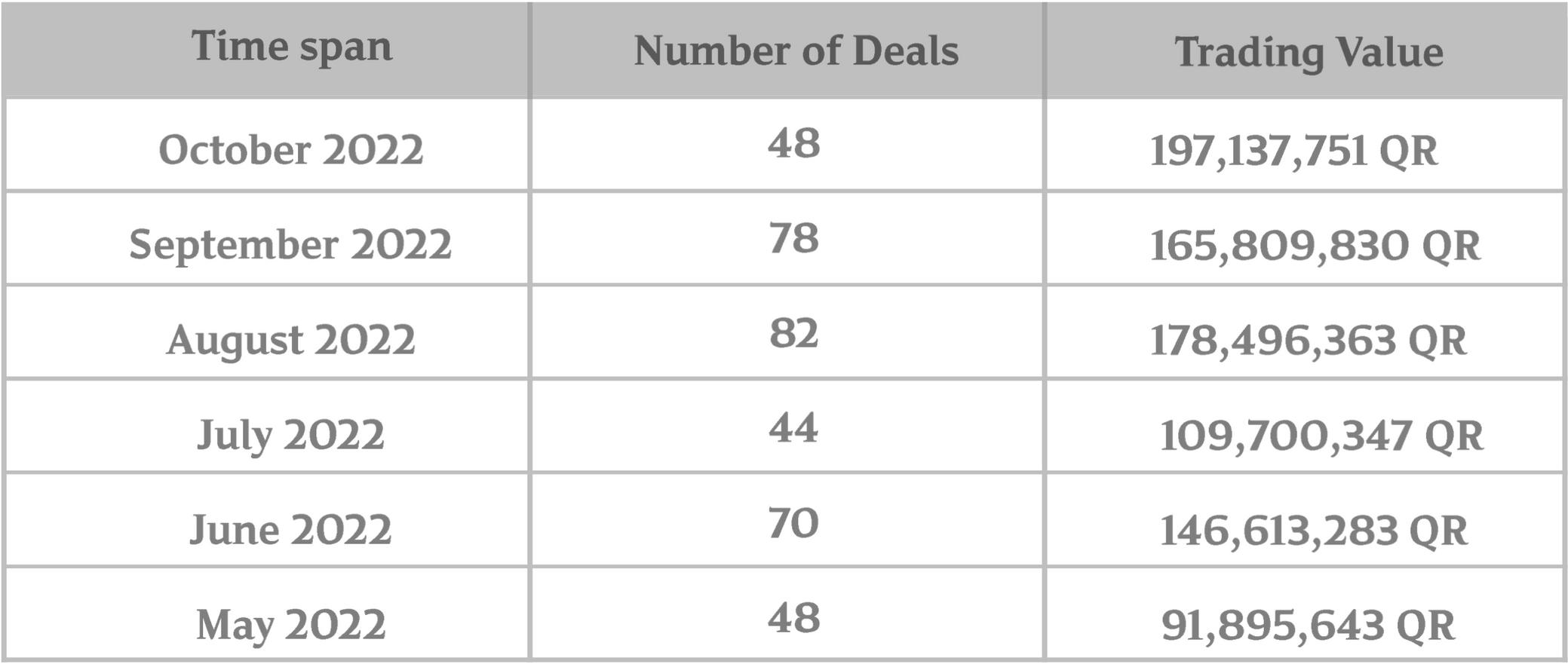 The real estate transactions index reached 1,492,507,657 QR for 301 transactions In October 2022 the real estate index decreased by 41% Real estate trading value index increased to 10%, while traded area index decreased by 20%