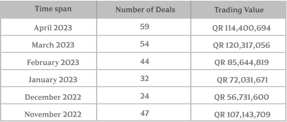 Comparison of Residential Units Trading Indicators April 2023 had a decrease in The Pearl and Al Kassar Area than March 2023 59 residential unit transactions totaled 114,400,694 QR