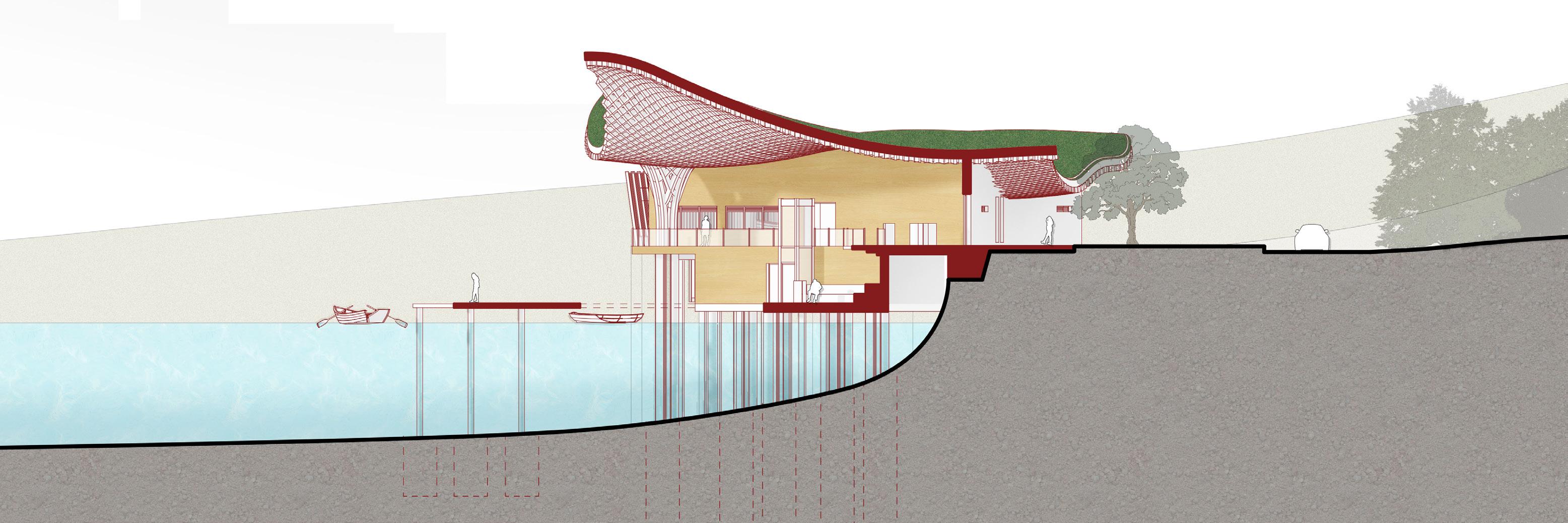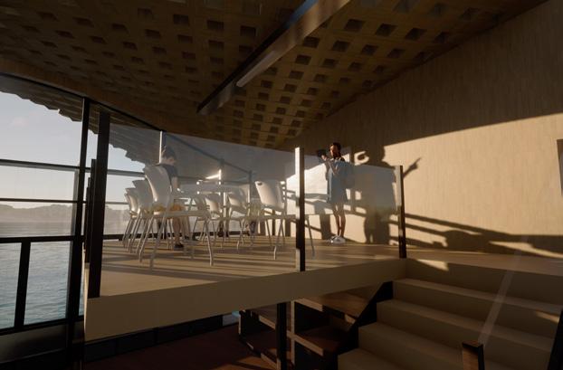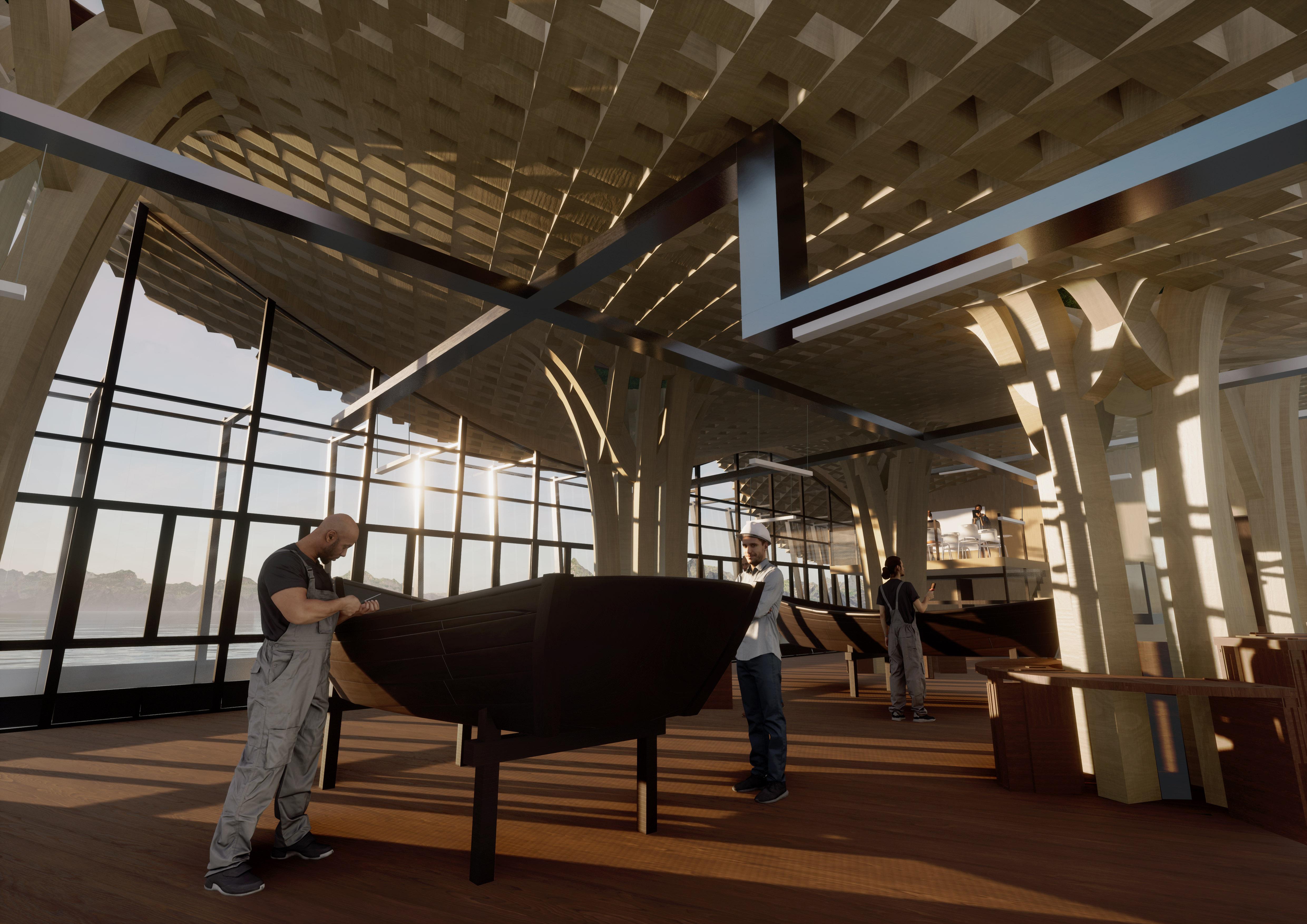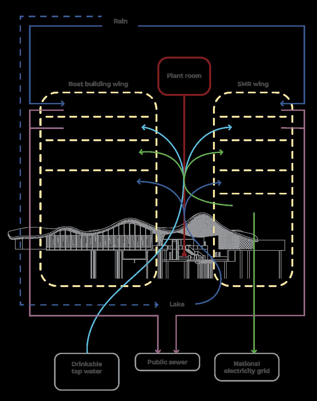 This learning centre is aimed to help empower the local community of Cumbria through the Sloyd education system (learning through craft) to tackle the ongoing unemploymentrelated issues, utilising the rising trend in UK boat export and resources already available in the area—human resources (skilled people of Cumbria in the nuclear and boatbuilding manufacturing industry) and materials (wood sourced from Grizedale). Small Modular Nuclear Reactor (SMR) in the scheme produces clean energy used in the building and the surplus is given to the grid, contributing to the UK’s goal of net carbon zero by 2050. This scheme is hoped to be the first step to a future of an empowered generation, powered by sustainable nuclear energy.
