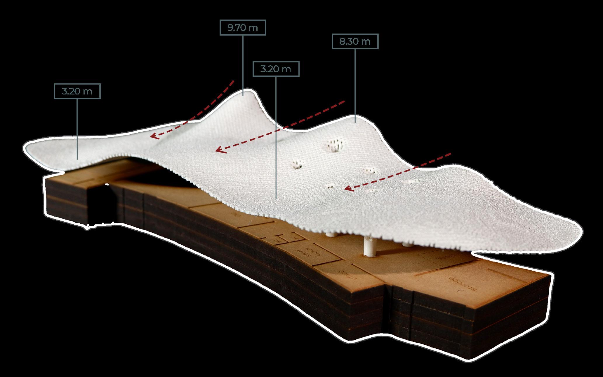 Roof above the foyer/dock upon entrance being the tallest (9.70 m) immediately welcomes visitors to a grand, scenic framed view of Lake Windermere. Second tallest space is the boat building workshop with a height of 8.30 m, indulging the students and staff also with an unobstructed view of the lake. Lowest points are above the toilets (3.20 m) to allow rainwater to flow naturally to these points, down the conventional drainpipes here, and used for flushing WCs. General downwards roof slope from the lakeside towards the road allows for rainwater to enter the feature vertical drainpipes in the centre of the columns.