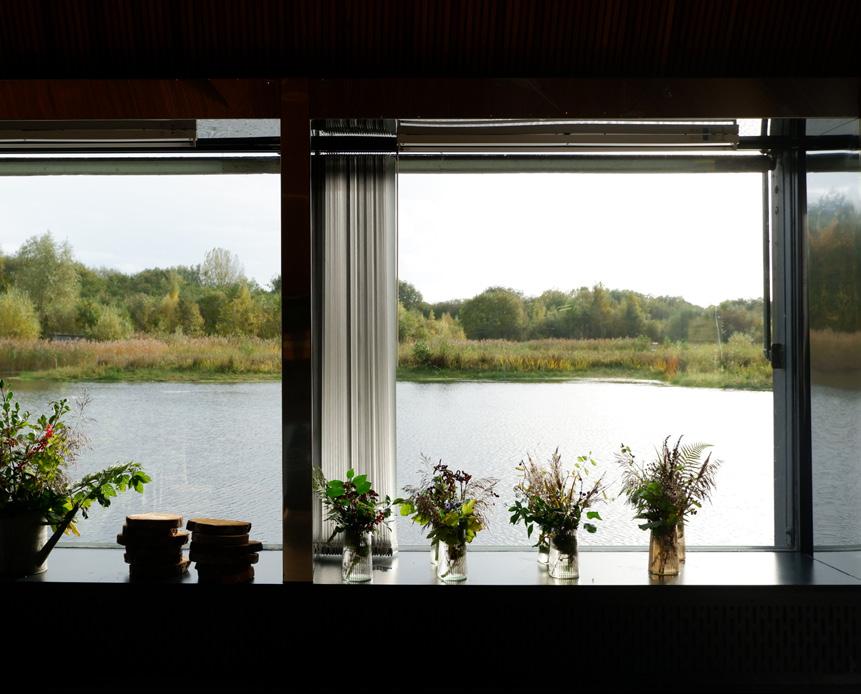 Internal windows allow for inner rooms to also get view of lake Glass vertical drainpipes in the centre of columns direct rainwater to lake below, users in the space are able to see water trickling down due to the choice of material