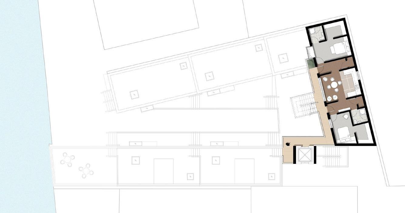 Narrow site surrounded by medium-height buildings only allows site to be exposed to limited amount of natural light from one direction: west, hence the introduction of stepped form and clerestory windows on the west side of the units.
