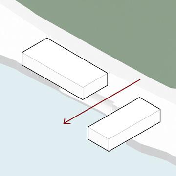 Lakeside elevation shows volume opening up, maximising the view of Lake Windermere whereas the roadside elevation mostly uses stone slips for cladding, sensitive to the neighbouring buildings and nature, creating a harmonious streetscape. Roof contour on the lakeside is also much more expressive than the roadside for this reason. Use of different cladding materials subtly distinguishes SMR and boat building wings.