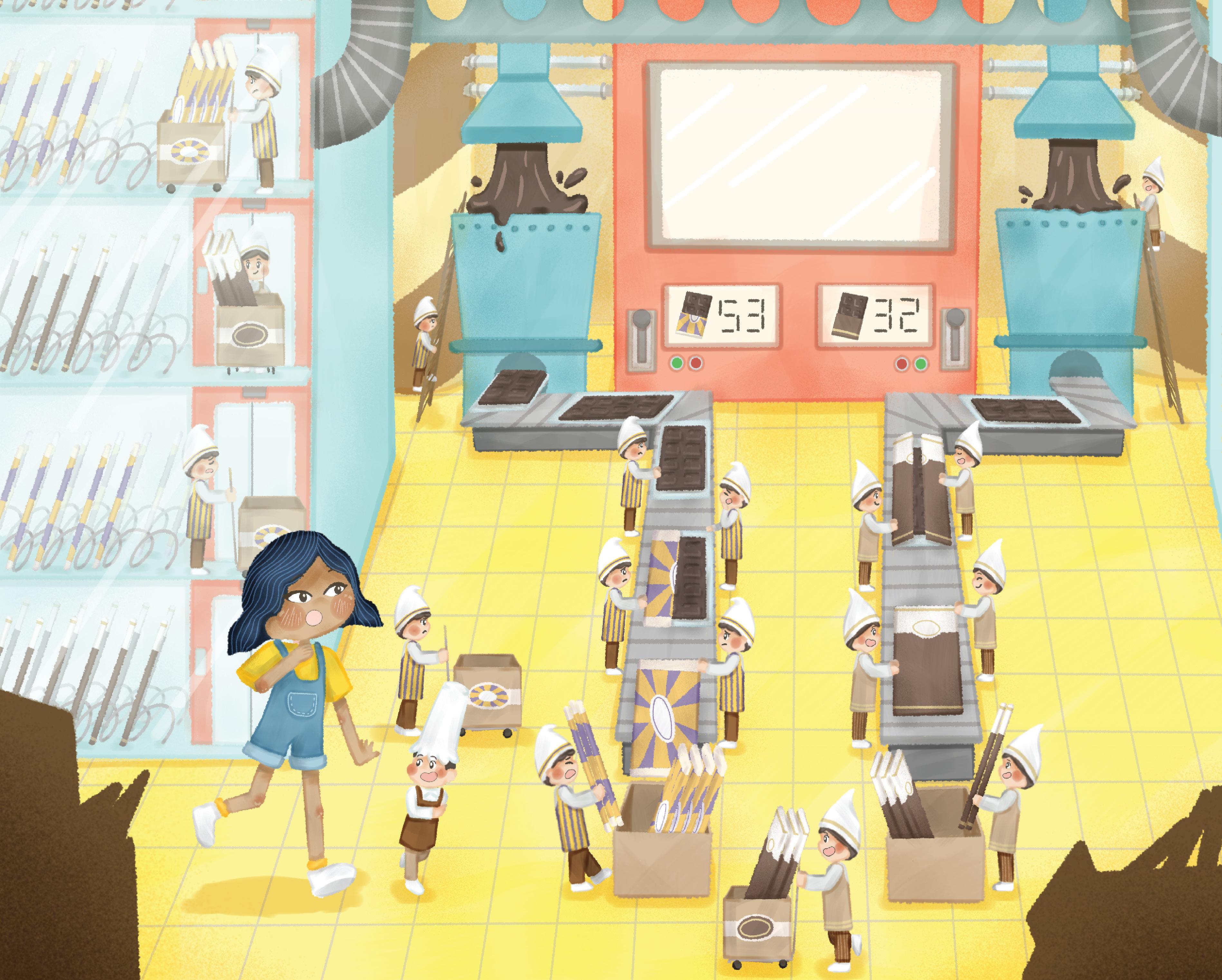 A girl named Anya shrinks as she enters a chocolate vending machine. Inside, she encounters some happy employees, while others appear less content. This artwork aims to highlight the existence of modern slavery systems that may be happening around us, often unnoticed.
