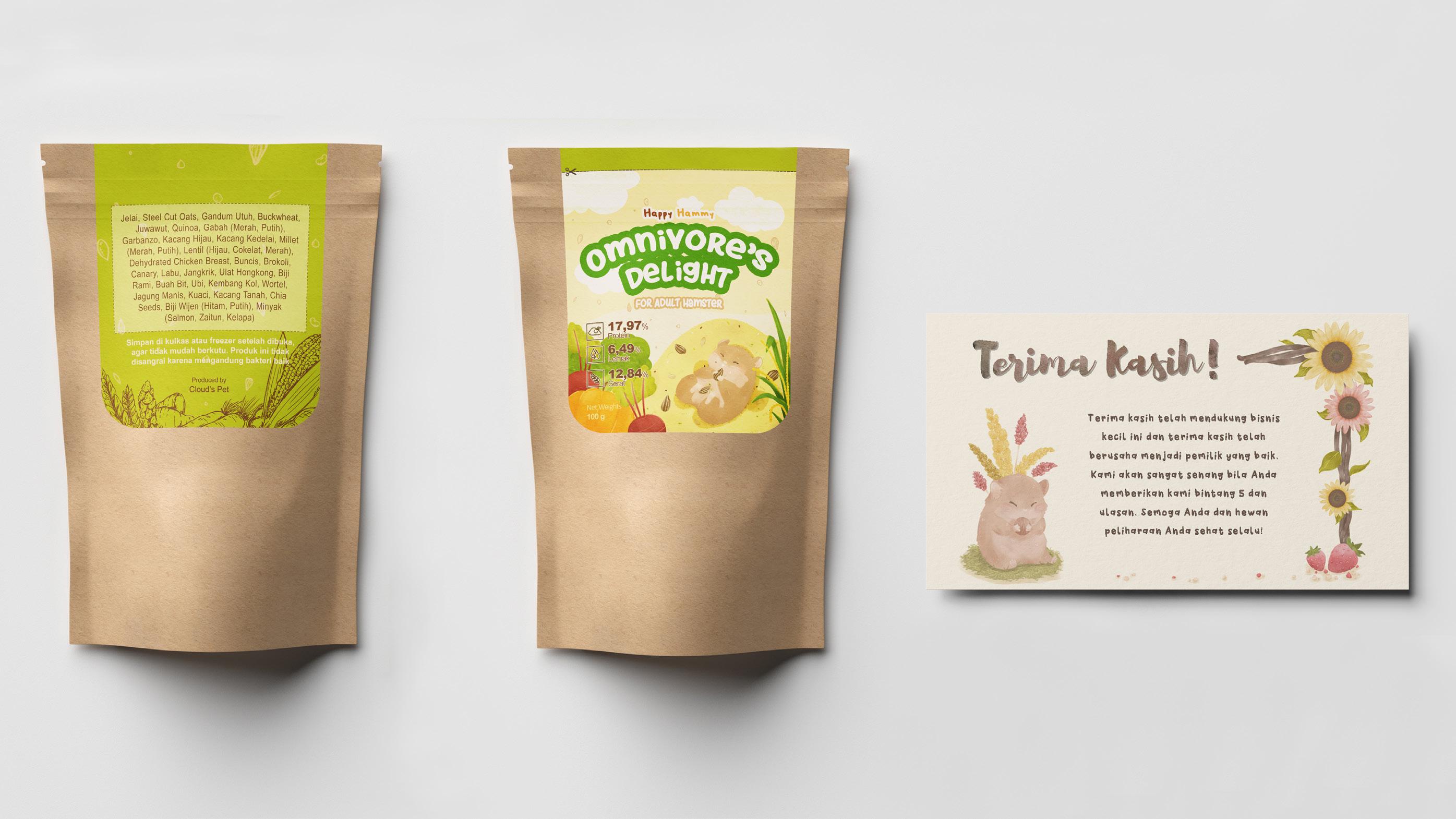 Create sticker packaging and a thank you card for customers who purchase Happy Hammy organic food for hamsters.