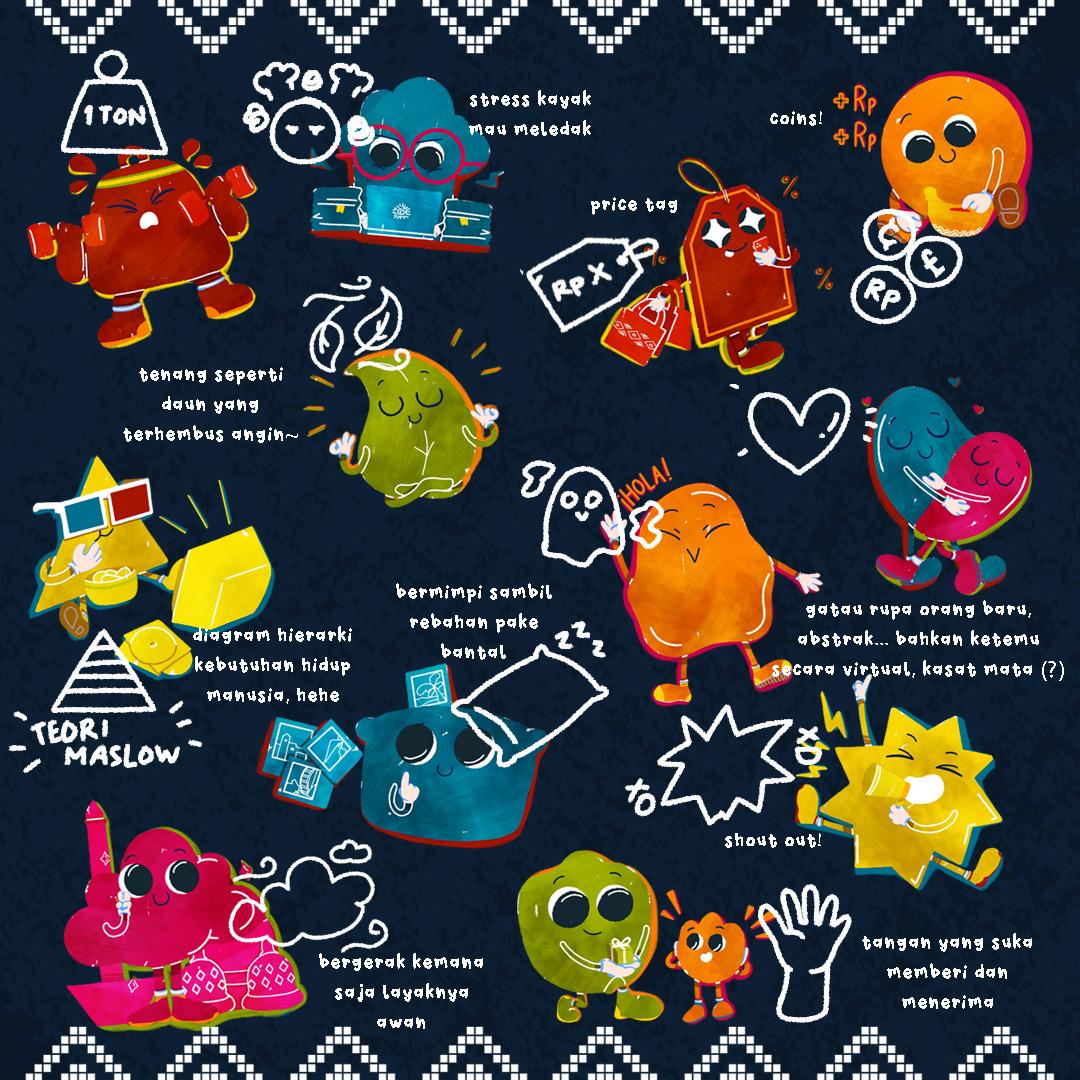 On this occasion, we were challenged to express what we felt for the new year. I illustrate our wish, either it has been done or still stays on our bucket list, as an abstract character. It happened because we have different appearances, but we have the same desires.