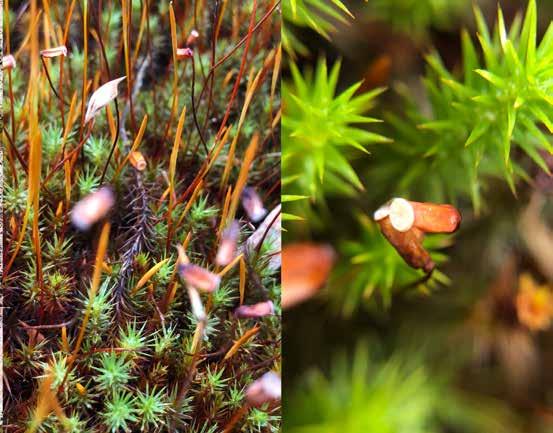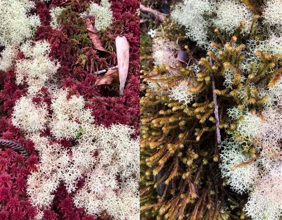 El esfagno, una clase de musgo acolchado, cubre la ladera creando tapetes multicolor sobre los suelos naranja. La contención.