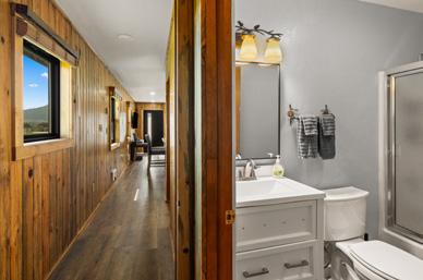 The staircase leads you to the upper level, where a versatile loft awaits — an inviting spot for a study, entertainment area, or extra guest sleeping. Past the loft, you’ll find the second expansive primary suite with its own private bathroom, featuring a dual-sink vanity, walk-in tiled shower, and refined finishes that blend style with function.