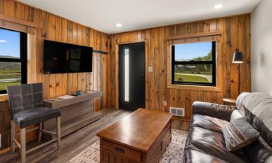 Designed for comfort, this unit includes one bedroom, a full bathroom, and a spacious living room. The kitchen is fully equipped with a dishwasher, island, and plenty of storage. Electric heat and a wood-burning stove ensure year-round warmth.