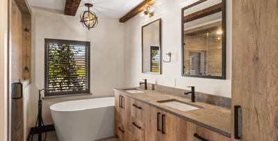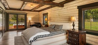 Moving down the hall, the home reveals a guest bedroom on the left, where sliding glass doors open to the deck, landscaped backyard, and river. To the right sits a half bath with laundry, blending convenience with design. At the end of the corridor lies one of the home’s two primary suites — a tranquil retreat with dual closets, a sitting area, and sliders that open to the expansive deck and hot tub. The adjoining en-suite bath shines with concrete countertops, a dual-sink vanity, a freestanding clawfoot tub, and a walk-in tiled shower.