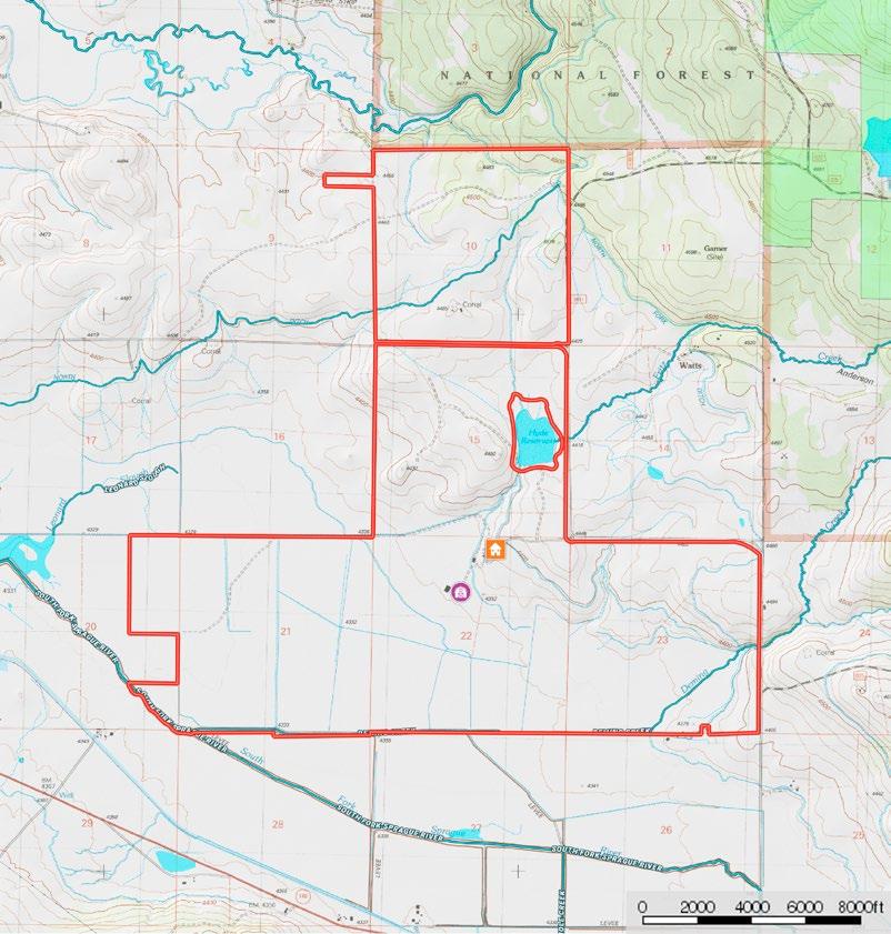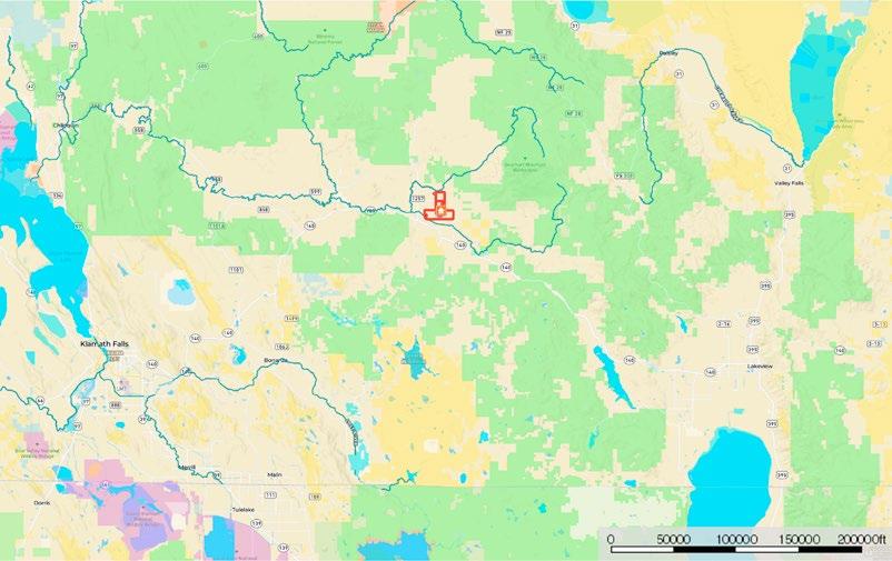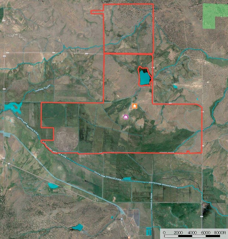 Per the Klamath County Assessor, the BK Ranch contains 3,298.19± deeded acres. Approximately 2,201 acres have irrigation water rights sourced from the North and South Forks of the Sprague River, Boulder, Deming, and Fritz Creeks, plus an irrigation well. Excepting approximately 260 acres under two centerpivot irrigation systems, flood irrigation provides irrigation water distribution from a 50± acre ranch reservoir and a series of dirt laterals and ditches. An additional 539± acres of dry pasture has areas that are sub-irrigated. The ranch’s remaining acreage encompasses uplands of native grazing, sagebrush, Juniper, and Ponderosa pine trees. The ranch topography is flat to gently undulating at an elevation ranging from 4,341± feet in the ranch’s Southern area to 4,518± feet in the ranch’s northern portion.