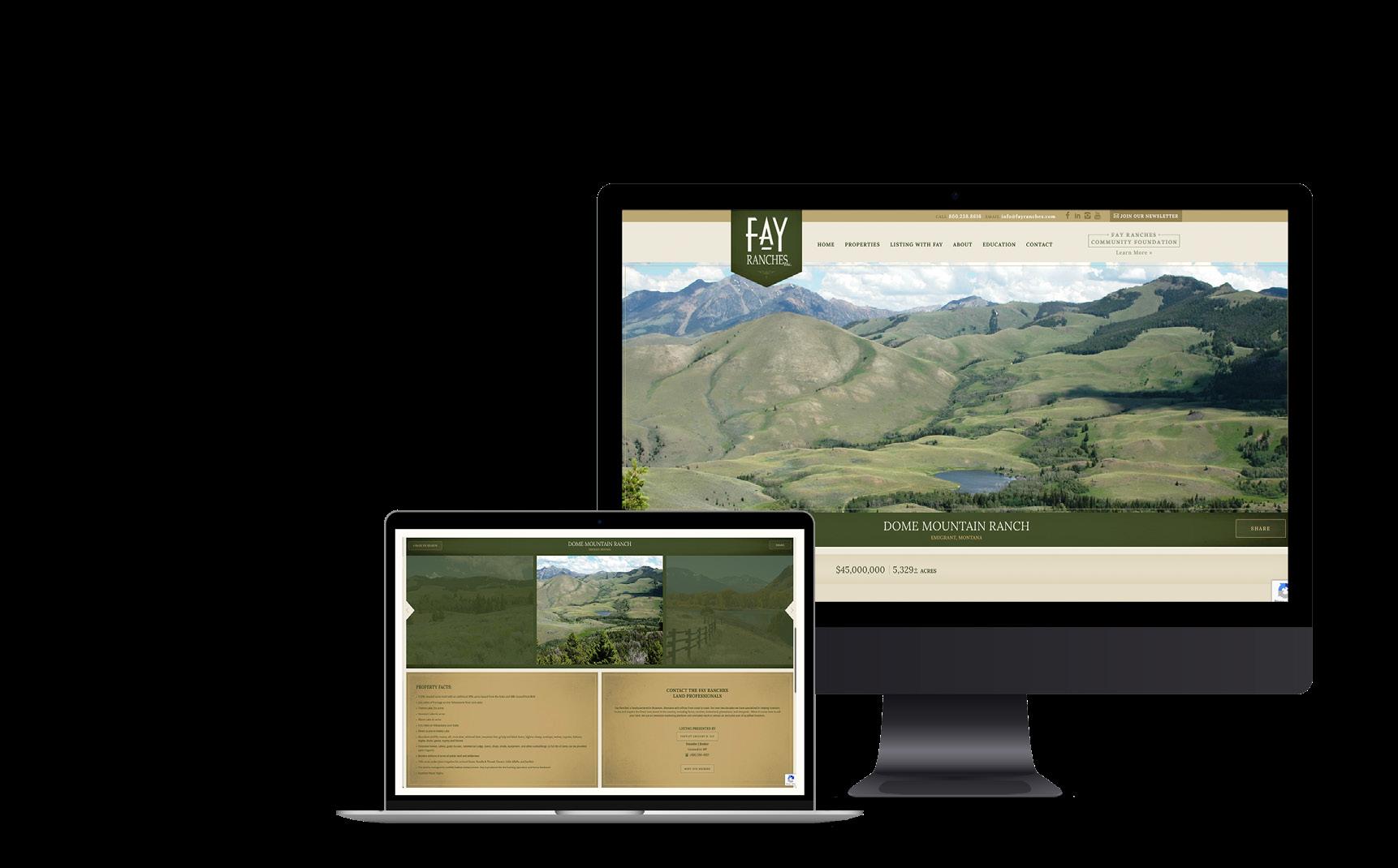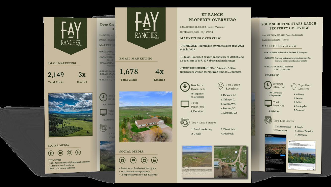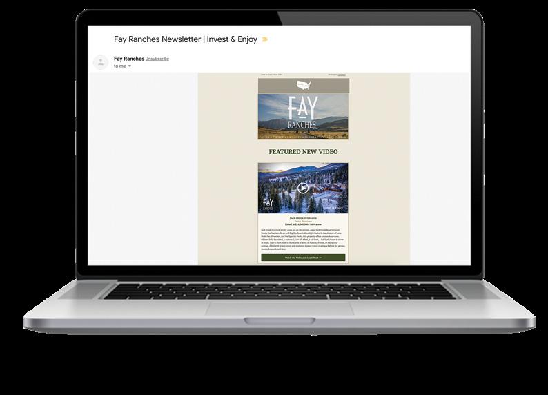is one of the most cost-effective marketing avenues, often yielding double the traffic on a listing website page. Fay Ranches has built a robust digital marketing platform. We market in sizable real estate aggregate sites like MansionGlobal.com, and digital newsletters like The Land Report, both of which have significant exposure.