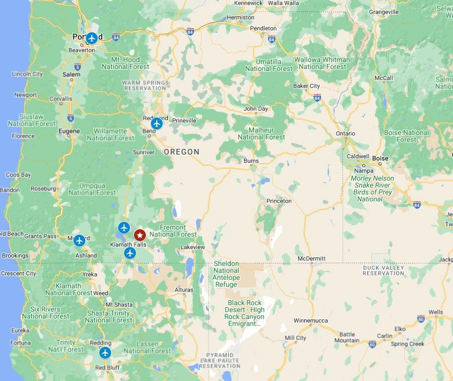 Portland International Airport (KPDX) , located 311 miles or just over five hours northwest of Klamath Falls, provides significant air connections.