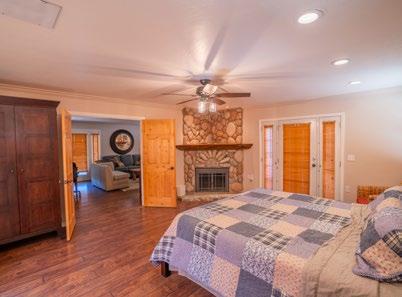 At the heart of the ranch, the three-bedroom, two-and-a-half-bath main home exudes timeless craftsmanship, featuring native rock fireplaces, exposed beam ceilings, and a covered porch overlooking manicured lawns and shaded paddocks. Nearby, a two-bedroom, one-bath guest house and a bunkhouse provide comfortable lodging for family, friends, or staff. Three additional residences, each with its own scenic setting, offer excellent opportunities for modernization or future guest accommodations, complementing the ranch’s versatility.