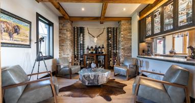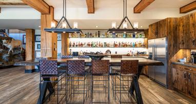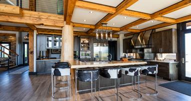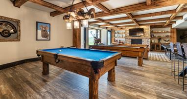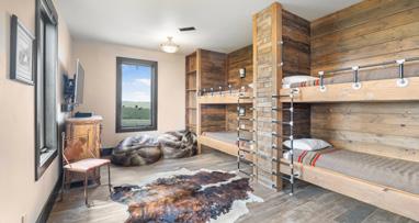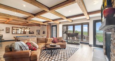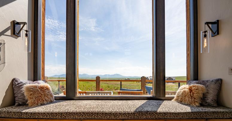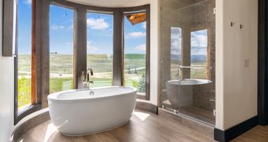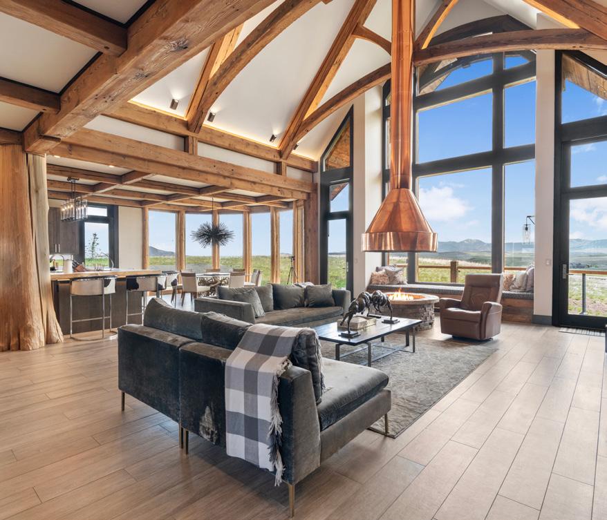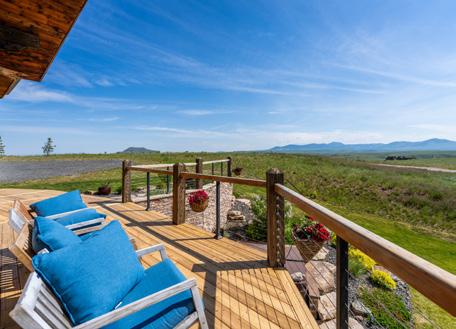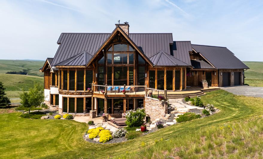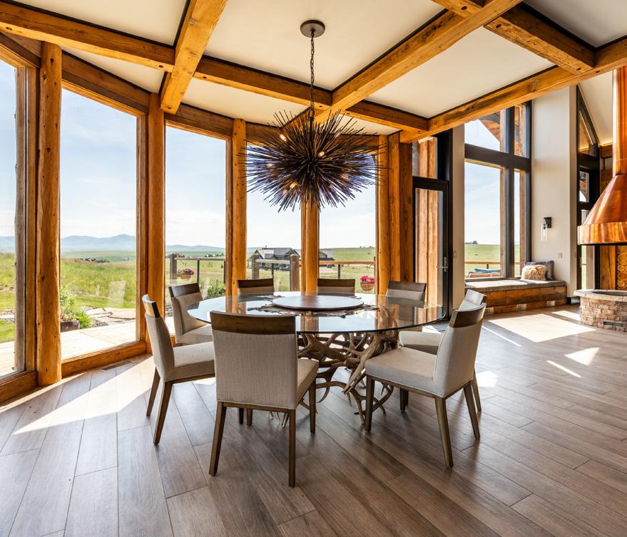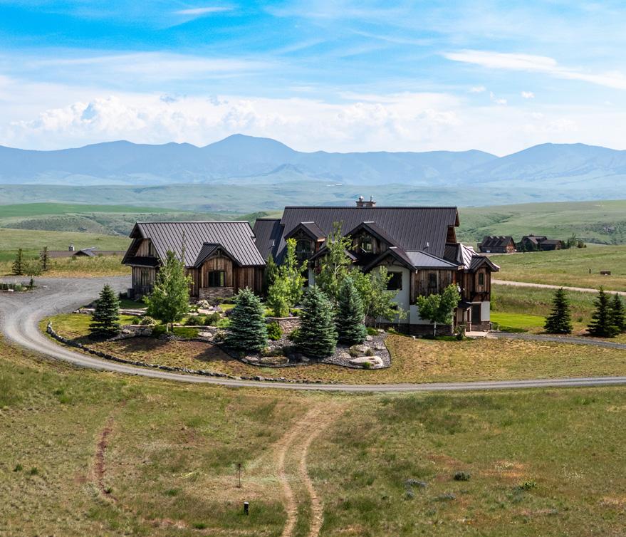 The home is a beautiful fusion of rustic Montana charm and modern design. With five bedrooms and a spacious upperlevel bonus area, it provides ample space for family and guests. At the heart of the home is the Great Room, featuring a circular gas fireplace, wine-tasting nook, and a striking wood accent wall—all surrounded by sweeping 360-degree views. The main-level primary suite offers a luxurious retreat with dual closets, while two more bedrooms are located on the main floor and two additional ones on the lower level. Downstairs, a large family room with a game area, wet bar, and walk-out patio with hot tub creates the perfect space for entertaining or relaxing.