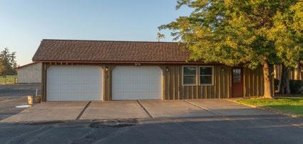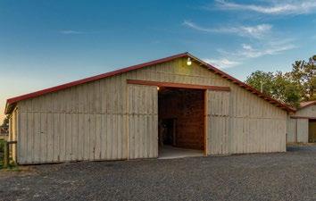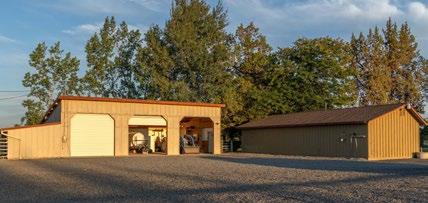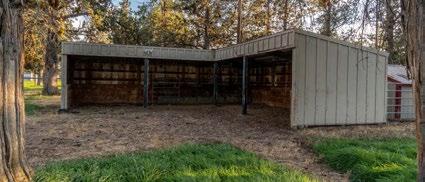 Directly behind the detached garage is a 3-bay storage/ shop building with roll-up garage doors that open into a large gravel barn yard. The building is isolated and has a workbench, a door, and a concrete floor. Wings built off the end and backside of the building serve as covers for five horse paddocks with Neilson automatic waterers.