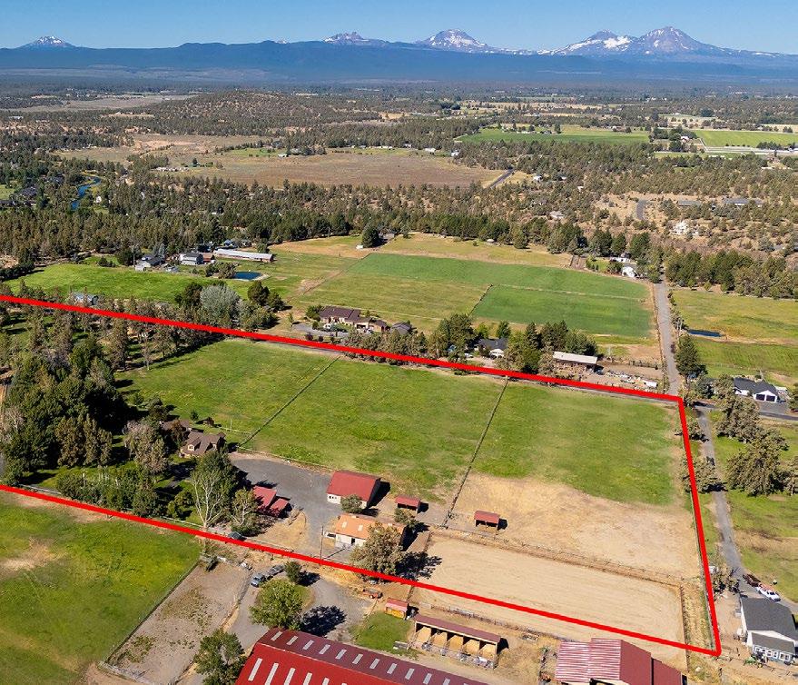 From the back porch of the primary residence, you have views of the Three Sisters: Faith, Hope, and Charity, as well as Broken Top with the pastures in the foreground. Mount Bachelor can be viewed from certain locations on the property.