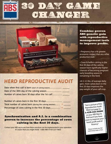 30 Day gAME cHANGER Combine proven ABS genetic gain with reproductive management tools to improve profits. • Pregnancy has a 4x greater economic impact that any other production trait. • Cows & heifers calving in the first 30 days of the calving season have significatly higher chances of becoming pregnant early breeding season & remaining in the herd.