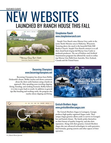 LAUNCHED BY RANCH HOUSE THIS FALL Steepleview Ranch www.steepleviewranch.com Steeple View Ranch raises Murray Grey cattle in the scenic Kettle Moraine area in Hubertus, Wisconsin. Towering above the ranch is the beautiful Holy Hill Basilica Church. Steeple View Ranch’s mission is to sell their closed herd of grass fed Murray Grey Cattle to seedstock producers. The use of Embryo and Artificial Insemination programs has allowed the ranch to utilize top Murray Grey Bulls from Australia, New Zealand, Canada and the United States.