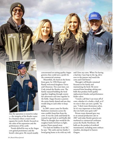 concentrated on raising quality Angus genetics that could turn a profit for the commercial cowman. Meanwhile, the herd on the home front grew. In 1996 Dawn and Randy welcomed daughters Tierra and Cheyenne. Two years later, son Cody joined the Kessler crew. The family enjoyed building the herd together, laughing through county fair adventures and time together in the fields. Angus became a passion the entire family shared and one they would cling to each other to keep going. In 2001 cancer came for Kessler. Radiation treatments across the state couldn’t keep him from the cows. It was the cattle and family he wanted to get back to and finally did. When he thought that would be the toughest battle he’d have to fight, partner Dawn passed away. “I’ve had two hobbies in my life,” he says. “My cattle and my family. I loved going home to be with my wife
