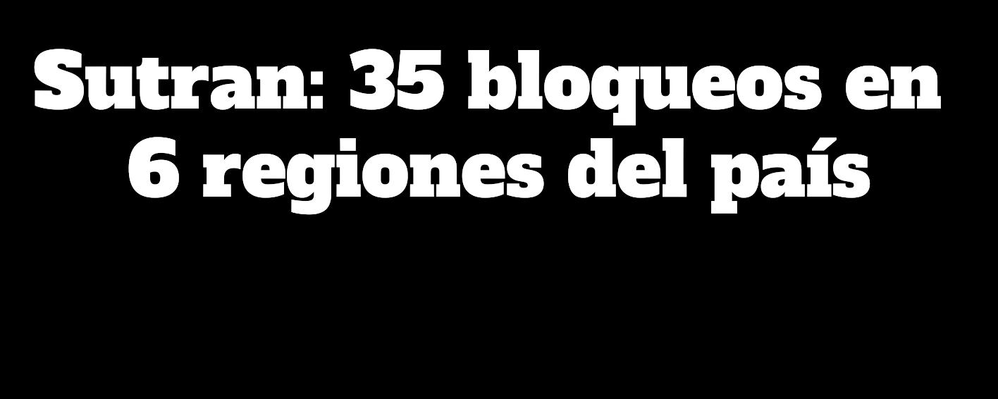 La Superintendencia de Transporte Terrestre de Personas, Carga y Mercancías (Sutran) informó este miércoles que son 35 los puntos con tránsito vehicular interrumpido en seis regiones del país como son Madre de Dios, Arequipa, Puno, Moquegua, Cusco y Tacna. Esto debido a las manifestaciones que se realizan en contra del gobierno de Dina Boluarte y el Congreso.