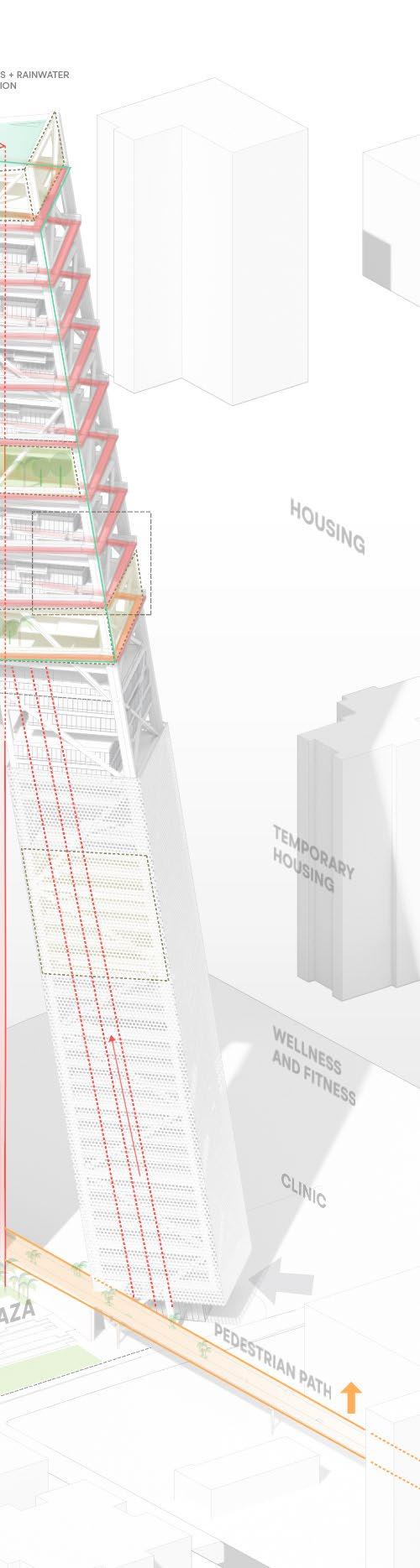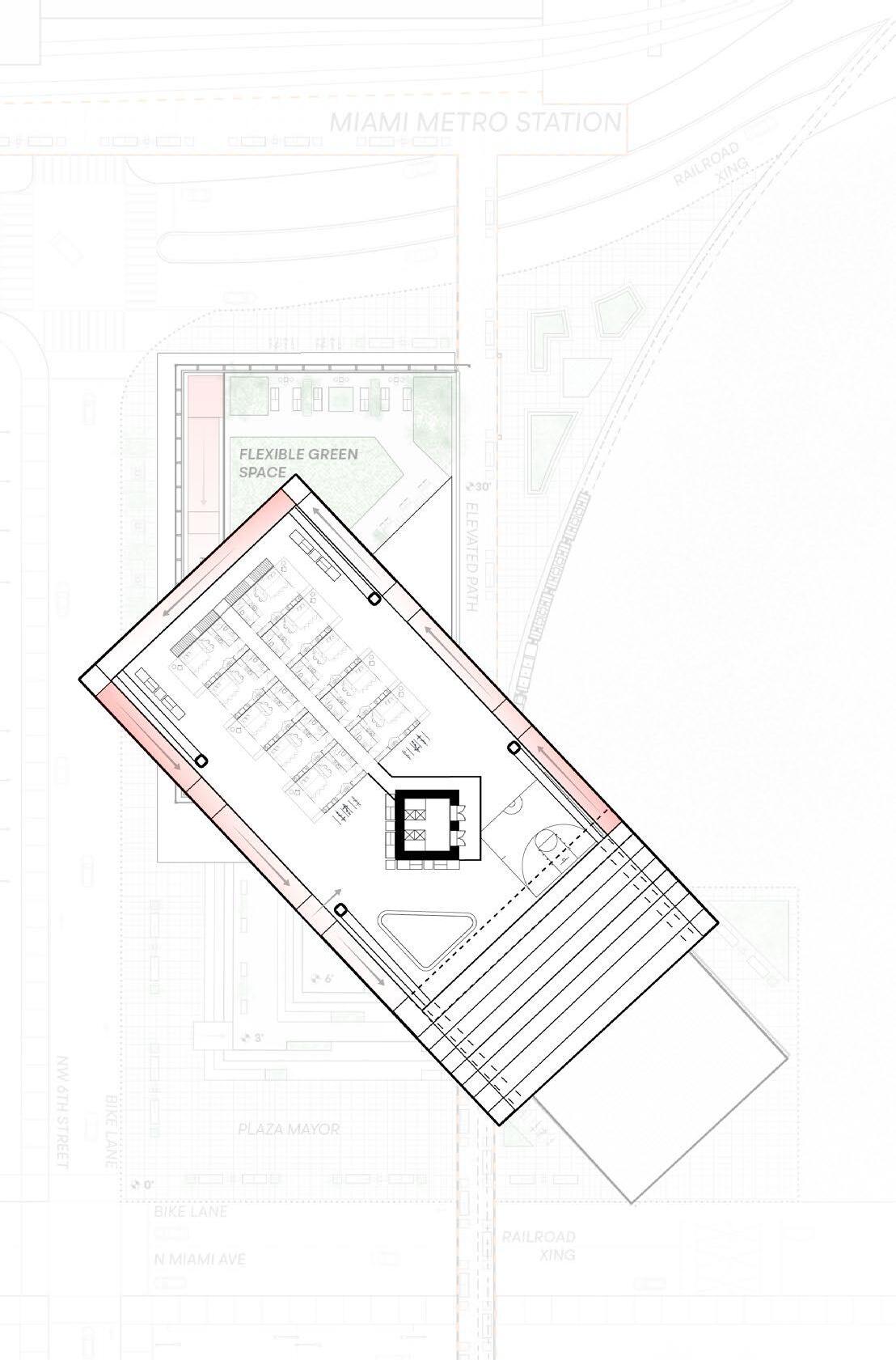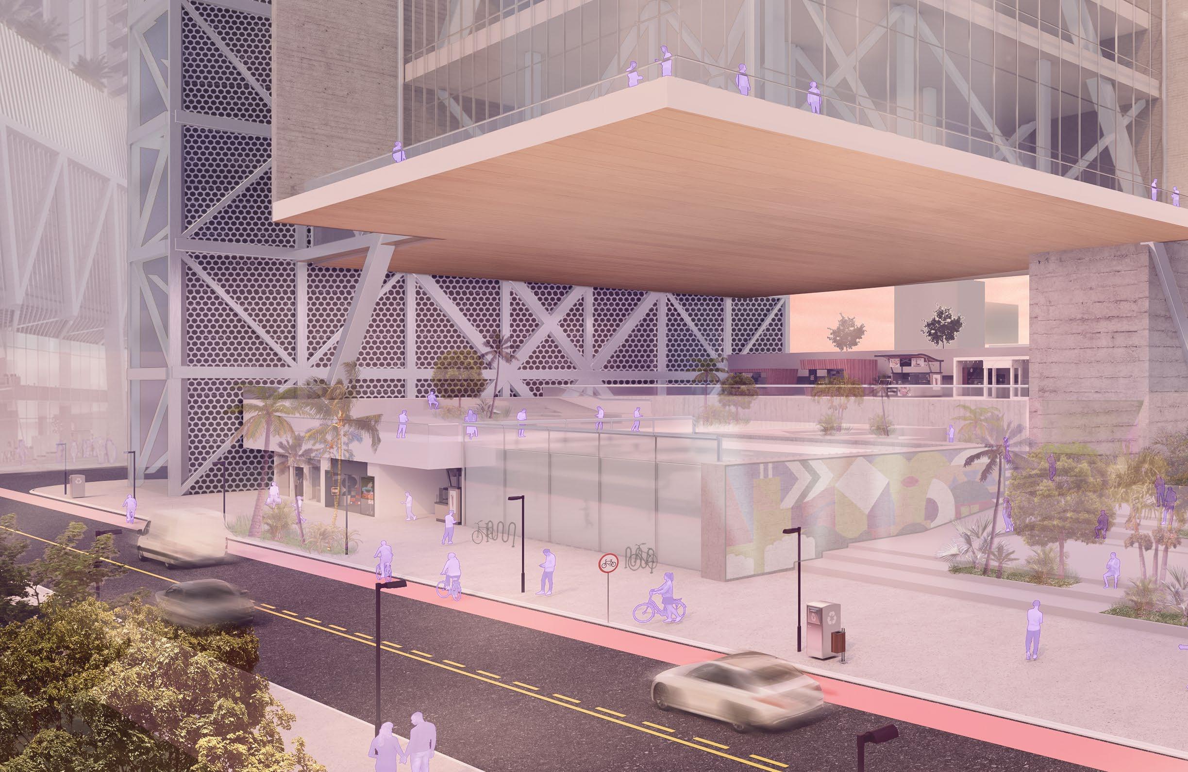 CIELO addresses a growing unhoused population and the lack of public space in Miami’s metro area. It uses vertical public amenities to invite people from all walks of life to inhabit and enjoy. The site was selected to show how spaces that are traditionally overlooked become vibrant centers for communities of the future.