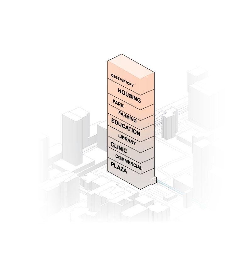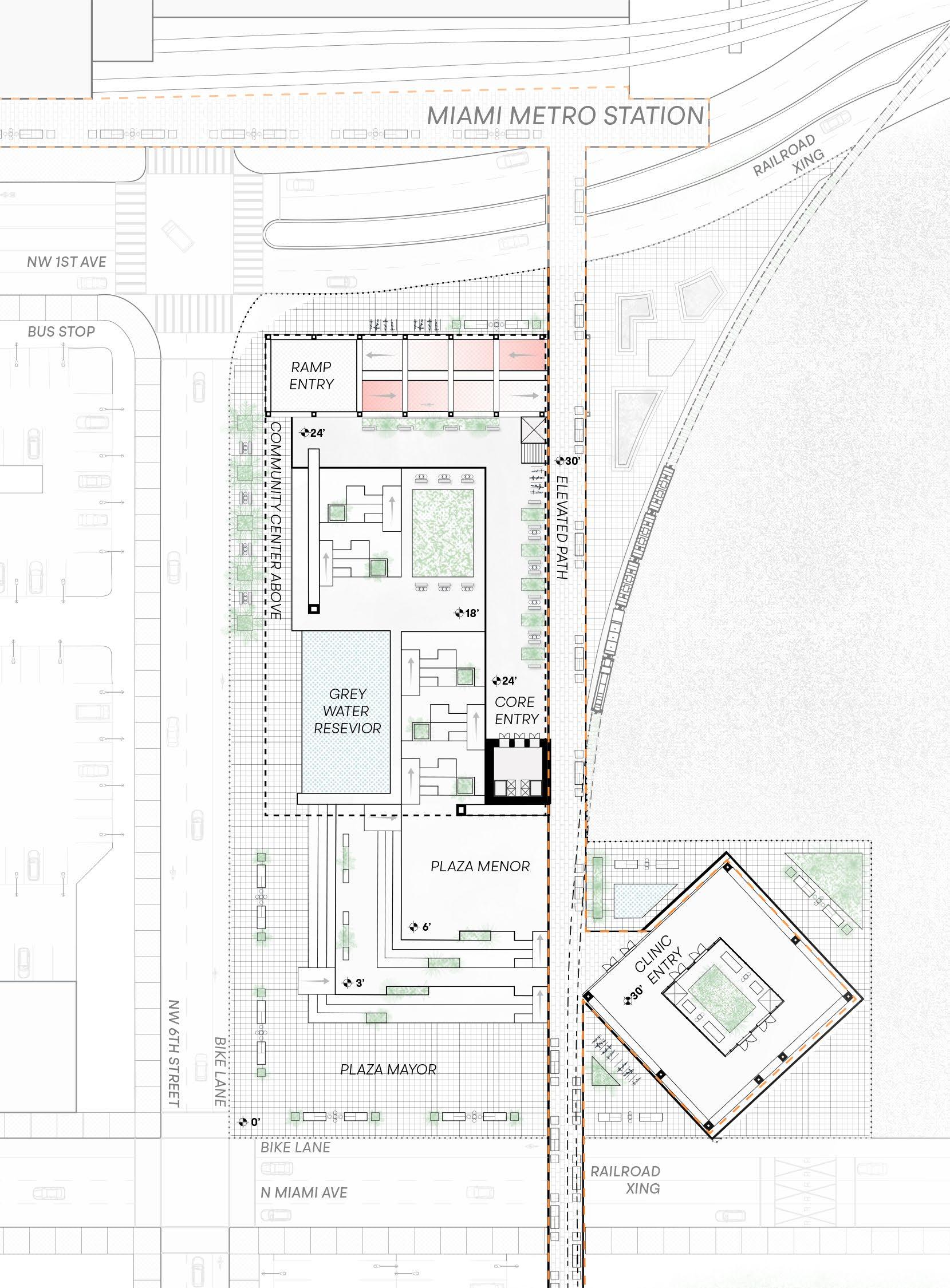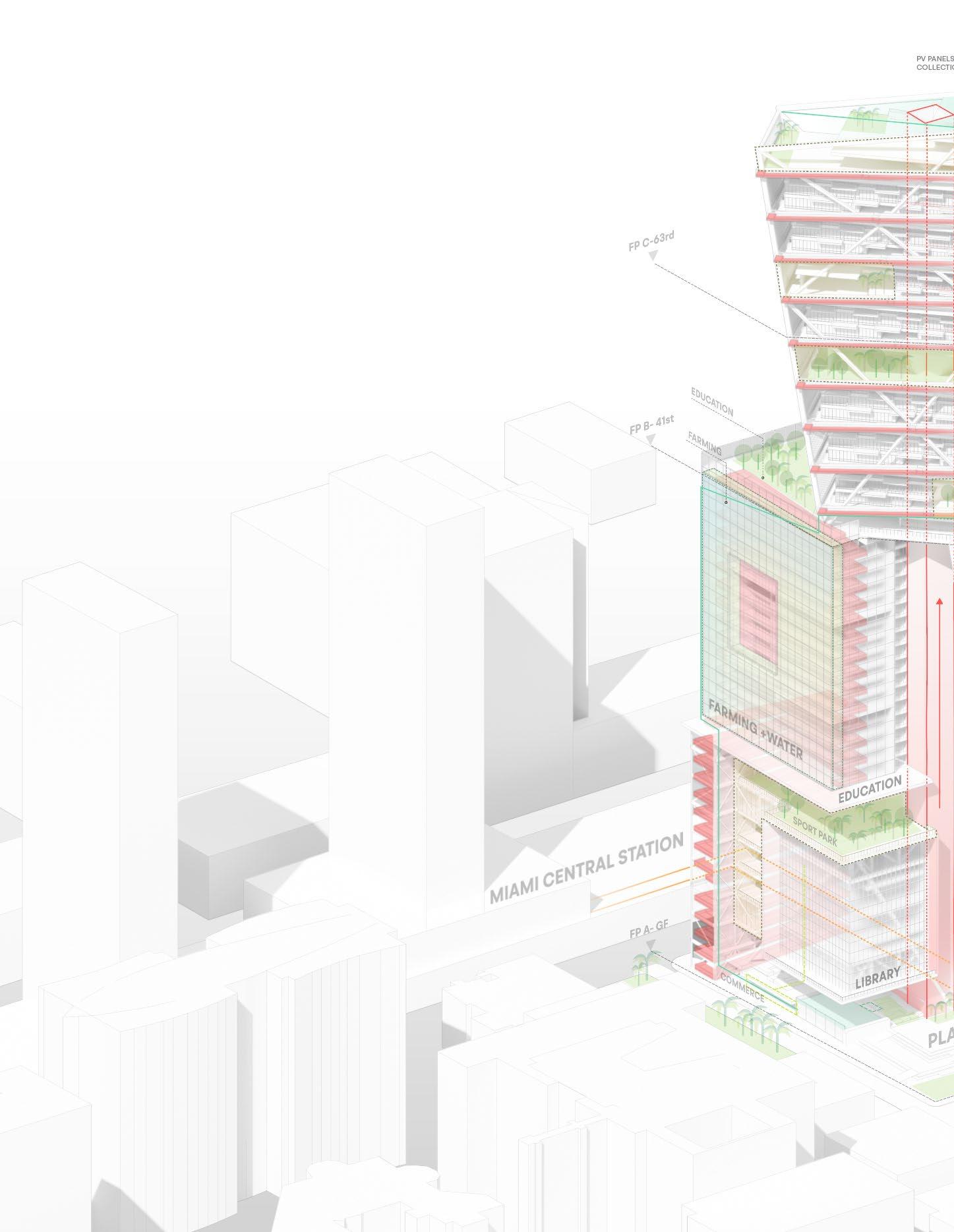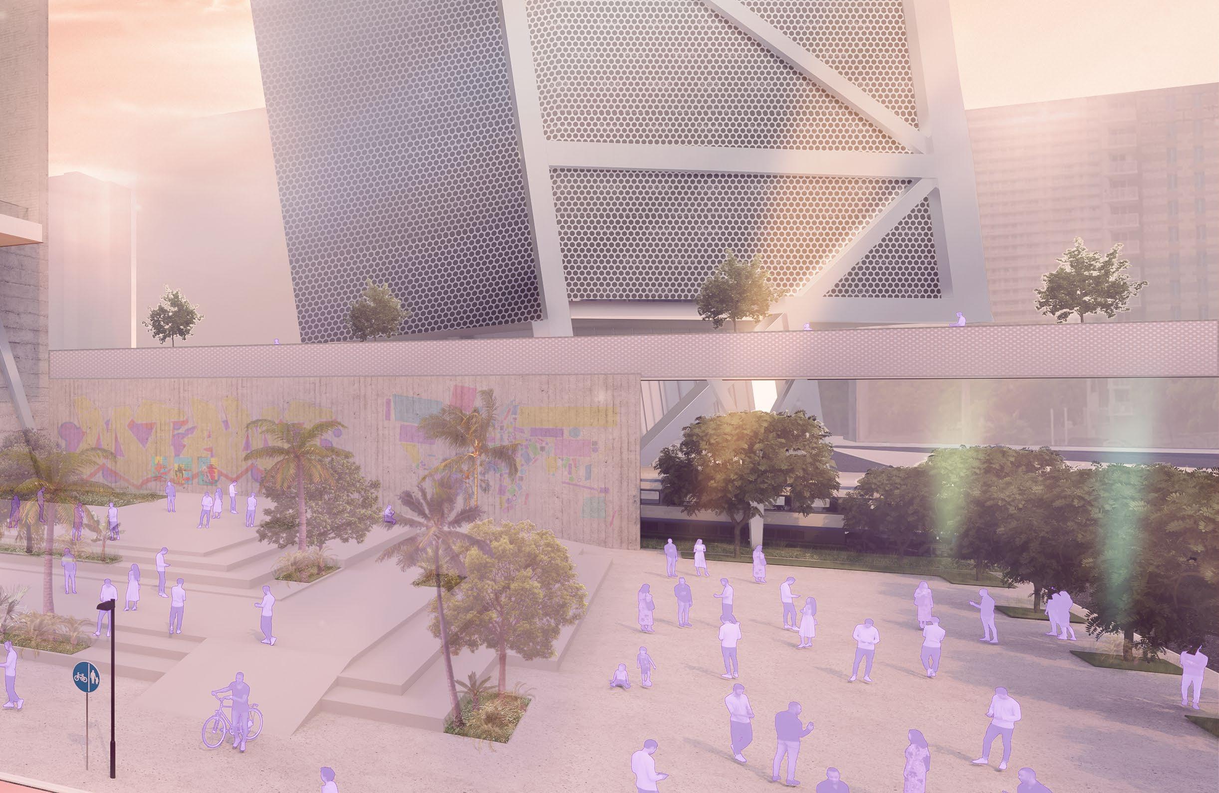 CIELO addresses a growing unhoused population and the lack of public space in Miami’s metro area. It uses vertical public amenities to invite people from all walks of life to inhabit and enjoy. The site was selected to show how spaces that are traditionally overlooked become vibrant centers for communities of the future.