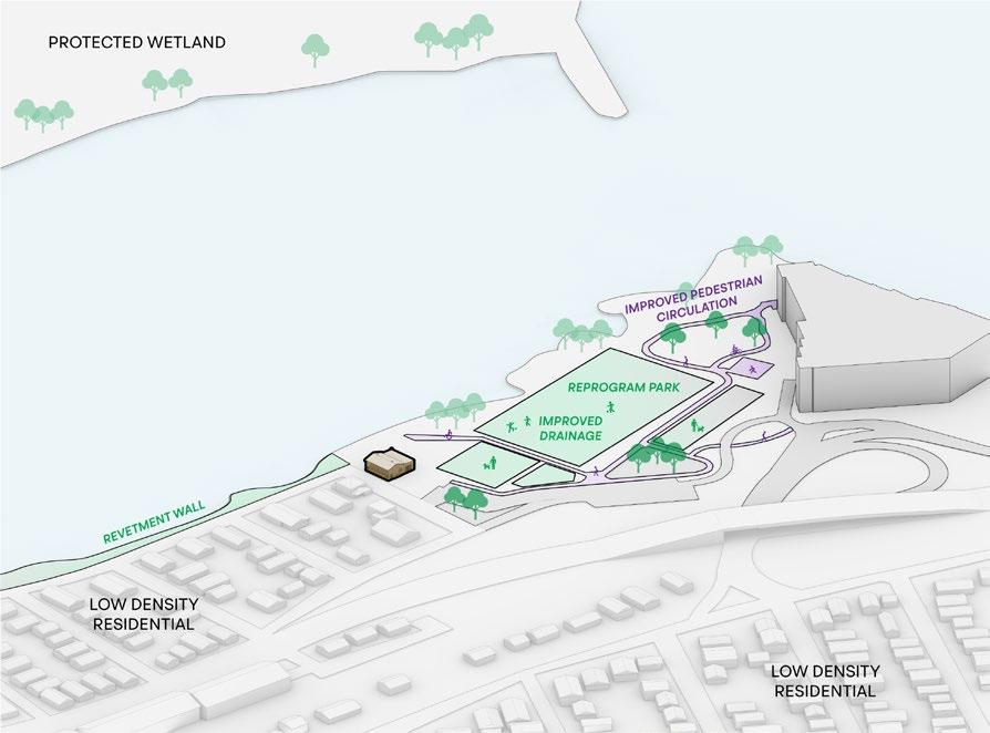 Park is reprogrammed with improved drainage, revetment dunes on the riverside, sports fields, dog park, and new