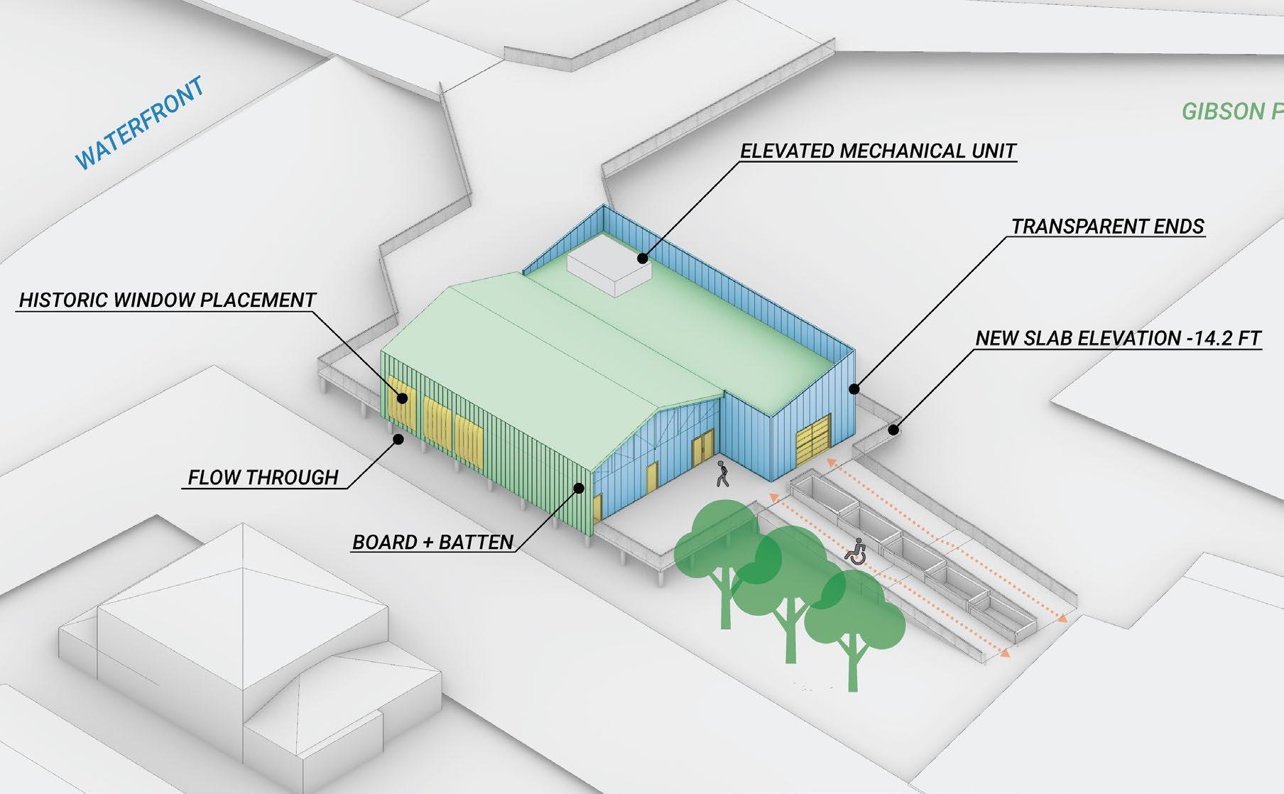 The boathouse is the final piece of the Gibson Park Redevelopment Project. The architecture serves as a handshake between the community, government, and natural environment