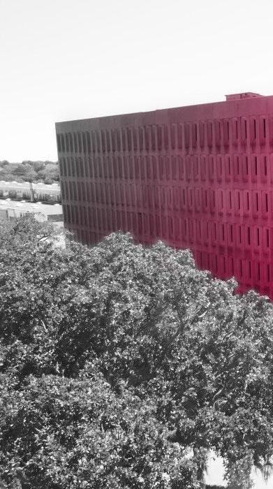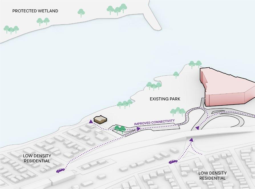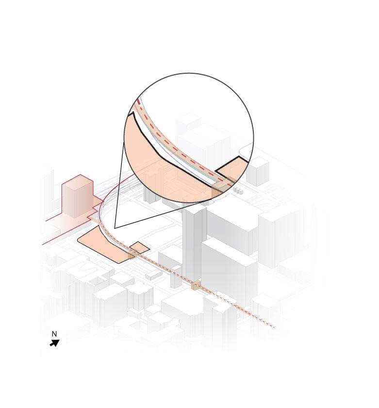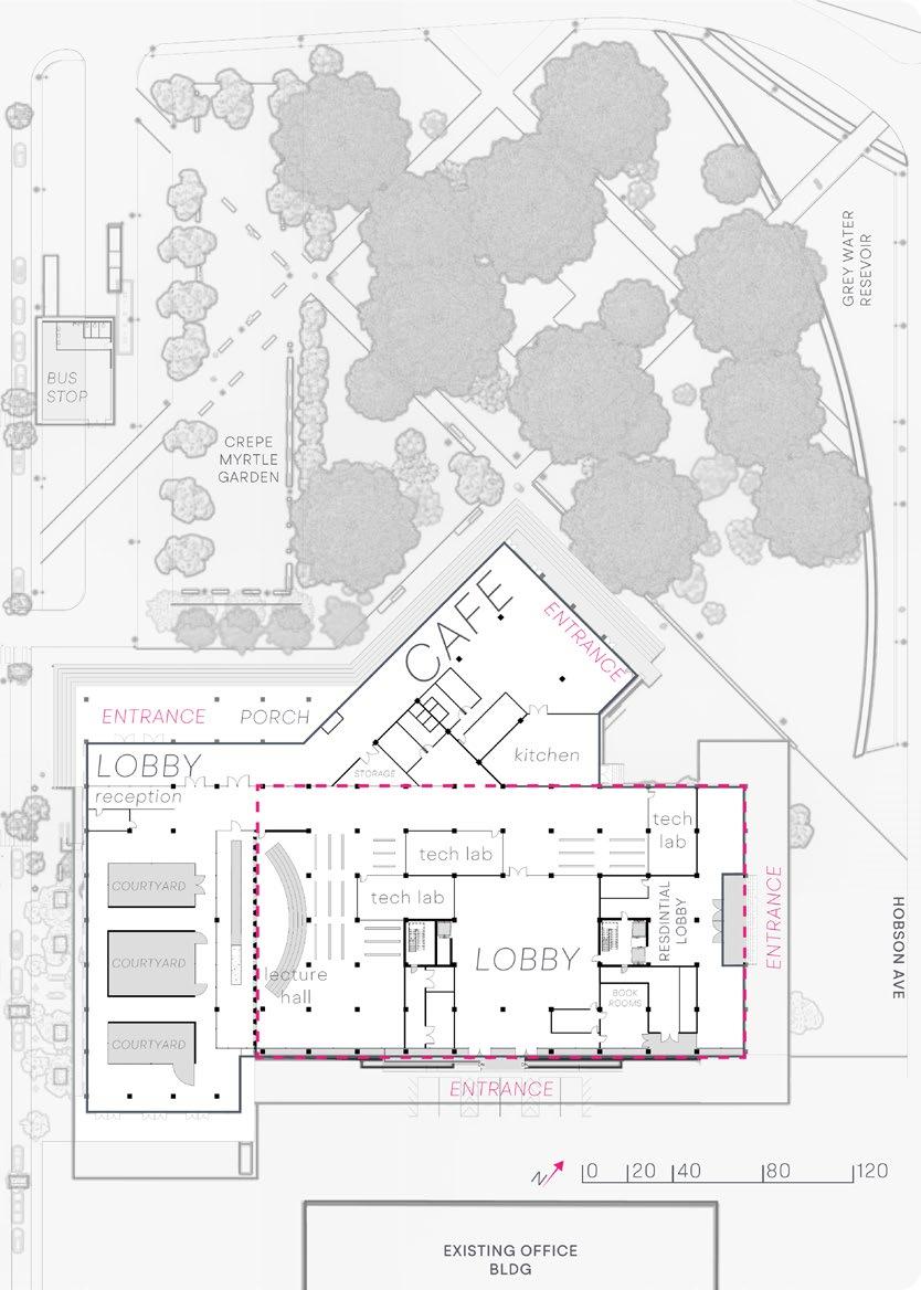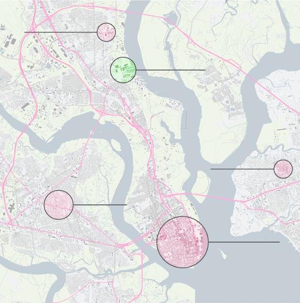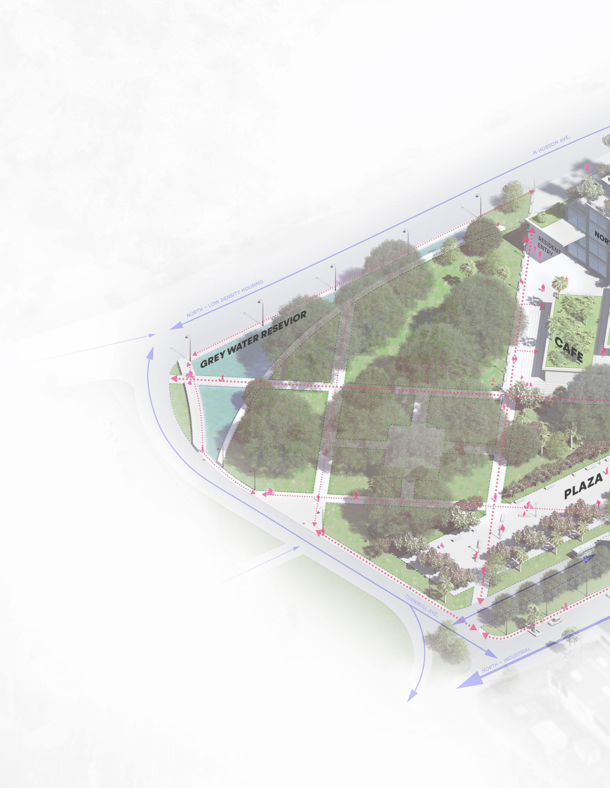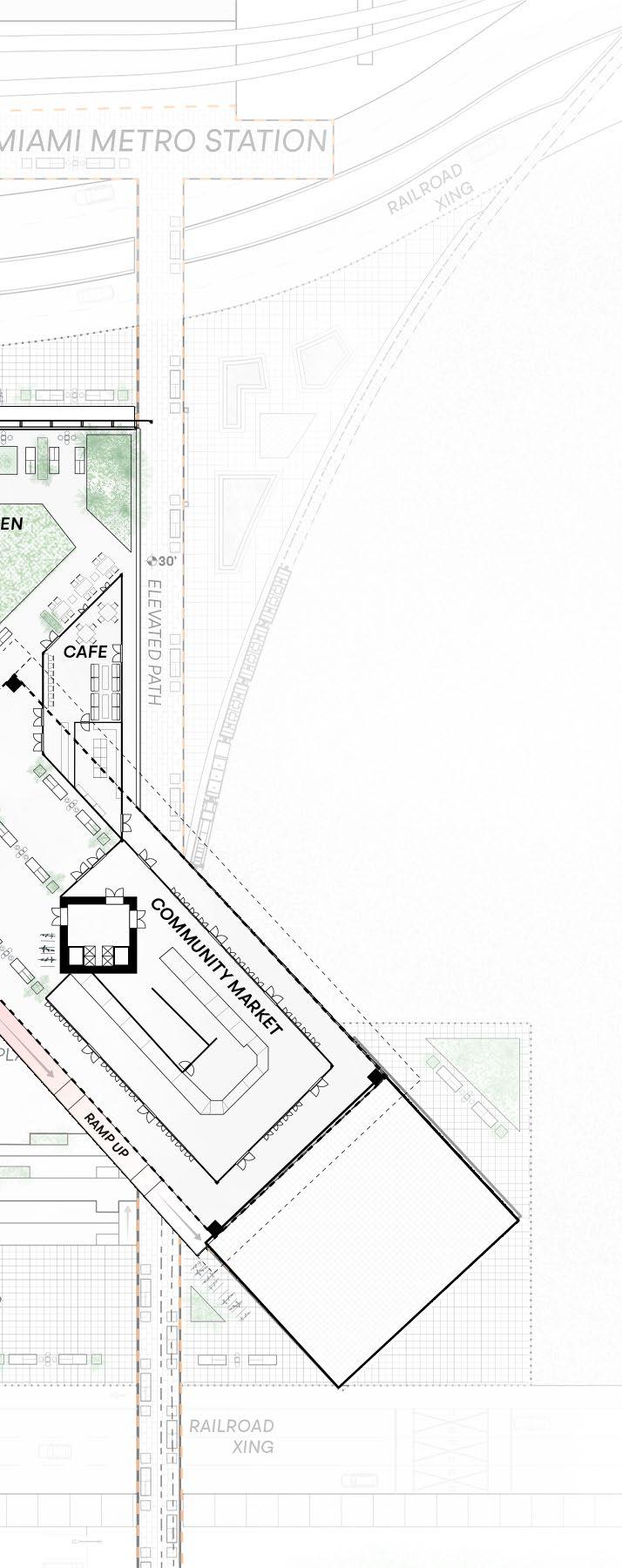 The Turnbull Ave. bus station is moved to the south western side of the site in order to minimize heavy traffic near the low density neighborhood. The green space circulation is optimized around 10 of the remaining live oaks from the 19th century garden. The derelict railroad infrastructure on the site is repurposed into a grey water cistern.