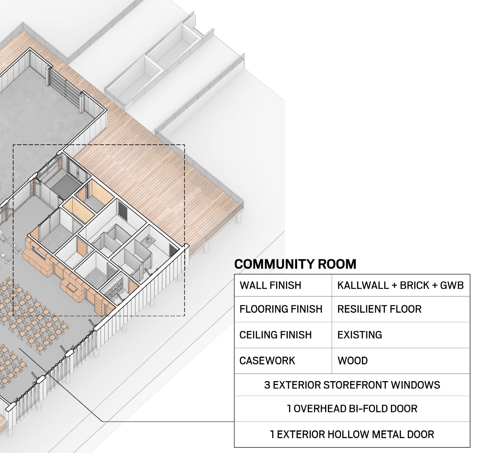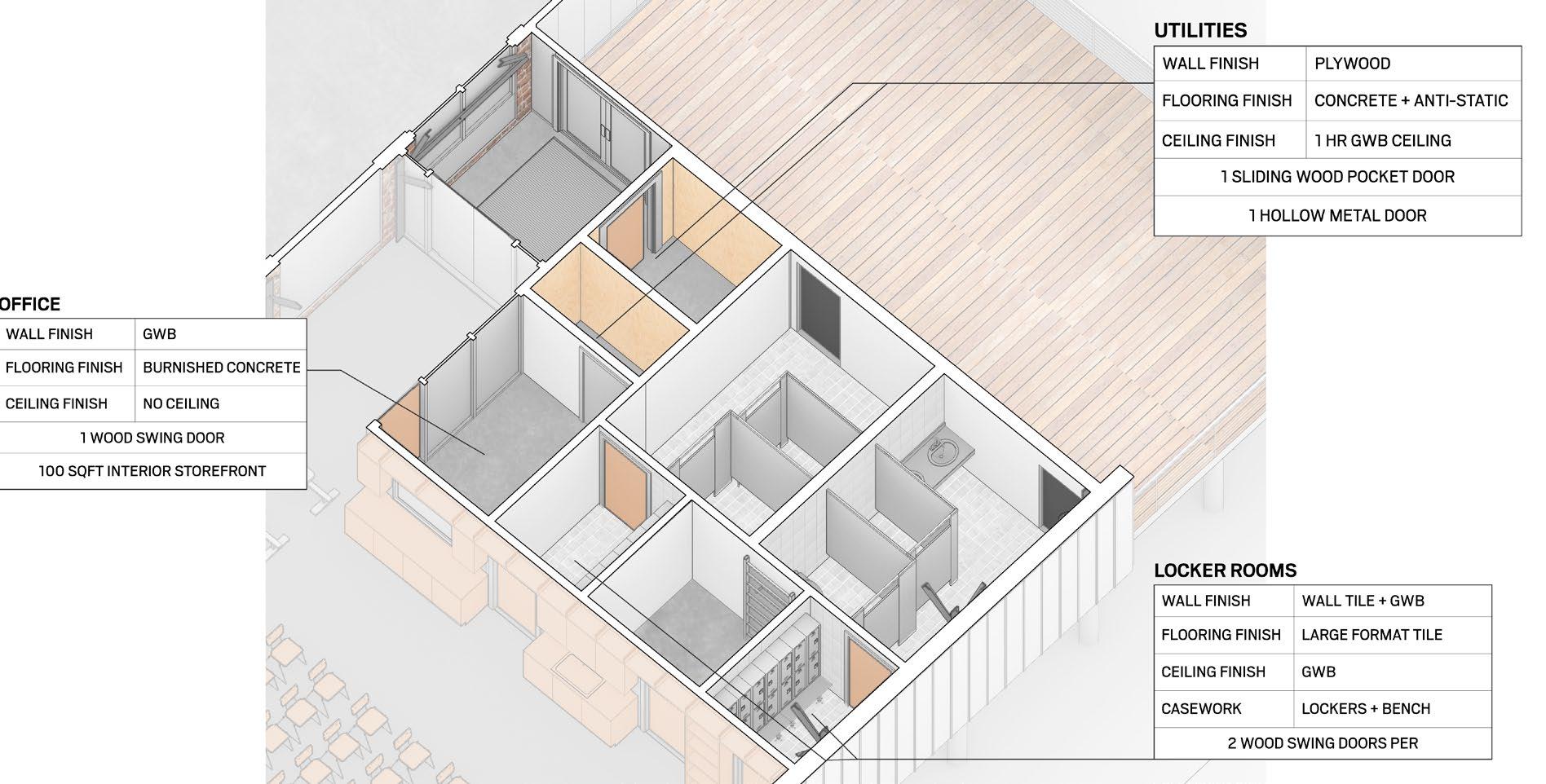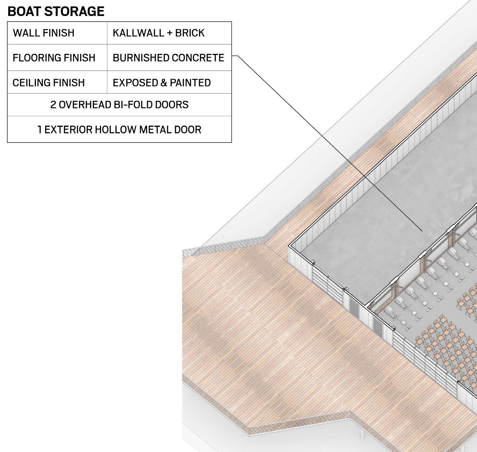 Material selection is based on the residential and natural context. The northern, residential facing facade is organized with board and batten siding, to coexist harmoniously with the existing material palettes. The southern, park facing facade are composed entirely of a translucent fiberglass material, evoking the buildings boat building past. Both east and west ends of the mass are clad entirely in translucent panels, in order to maximize daylighting and minimize artificial light usage.