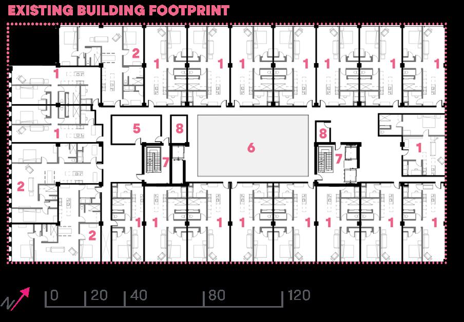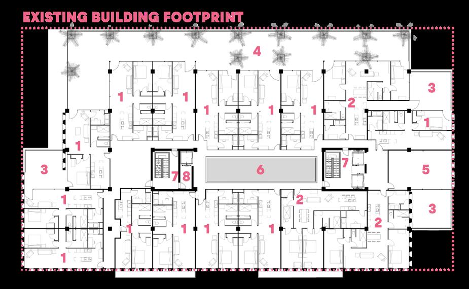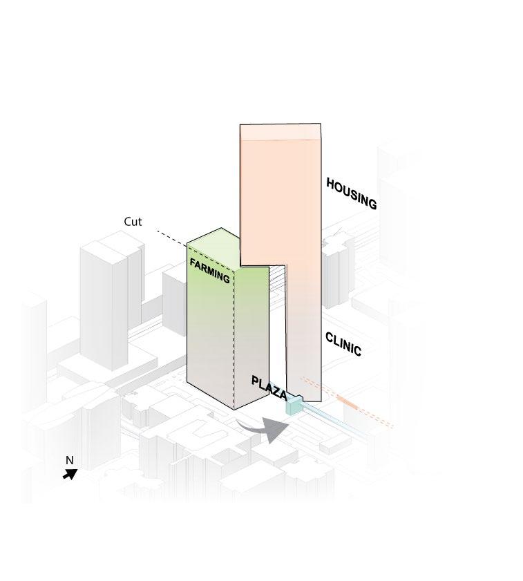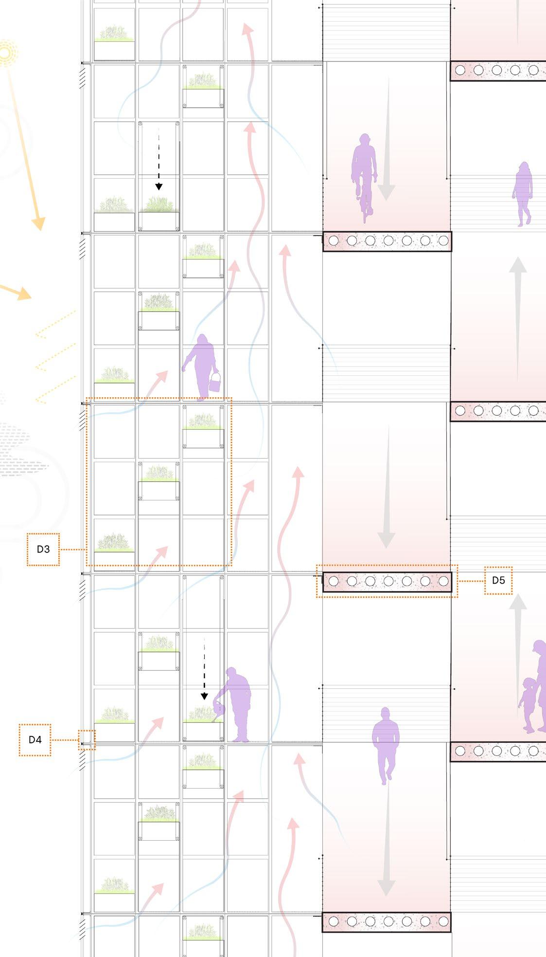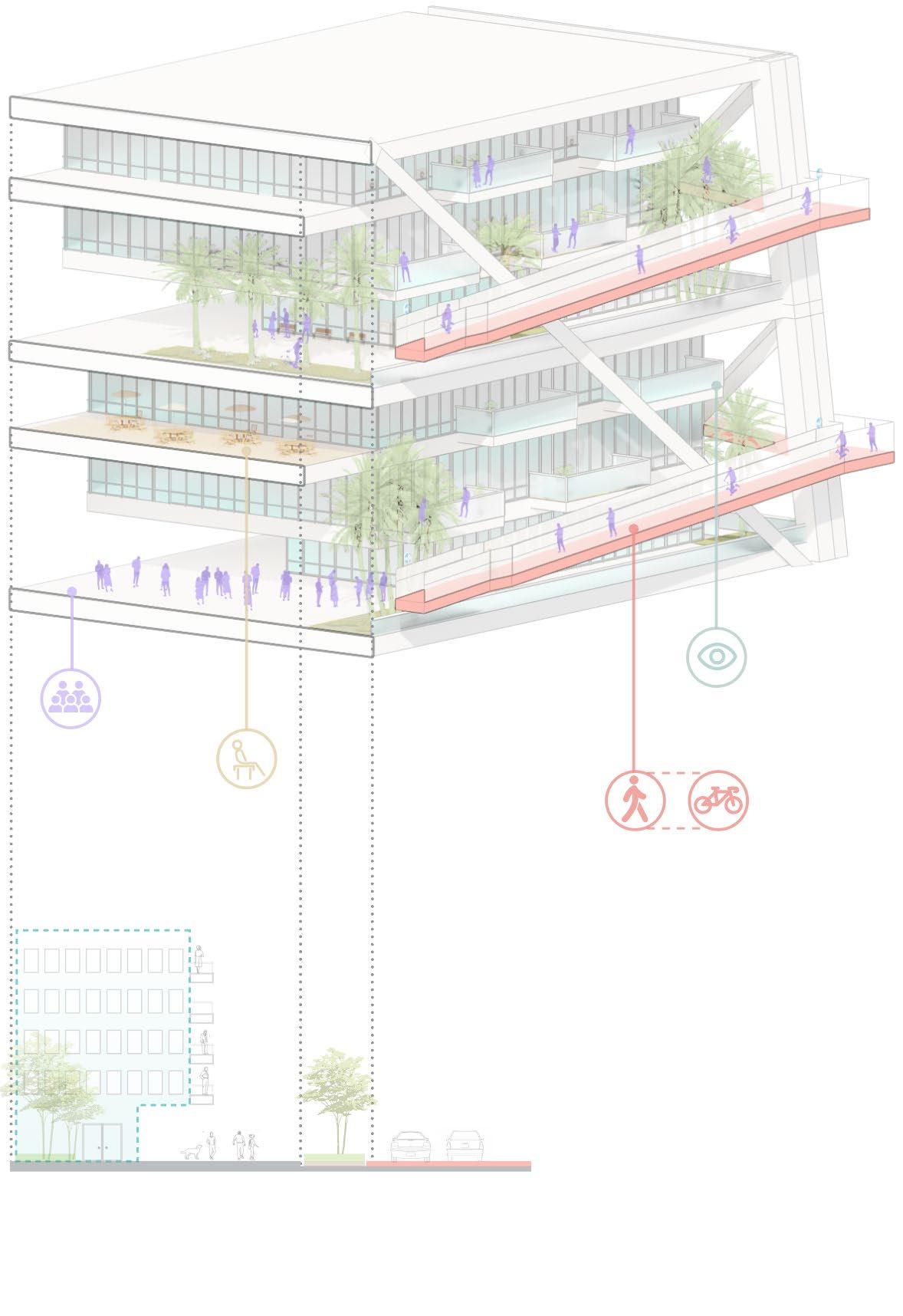HOUSINGThe housing component is comprised of one and two bedroom apartments, their form derived from the column grid of the existing 6 story office building. A vented core atrium serves as a passive cooling and natural lighting mechanism. Large public and small private terraces offer variety in scale and privacy in outdoor spaces.