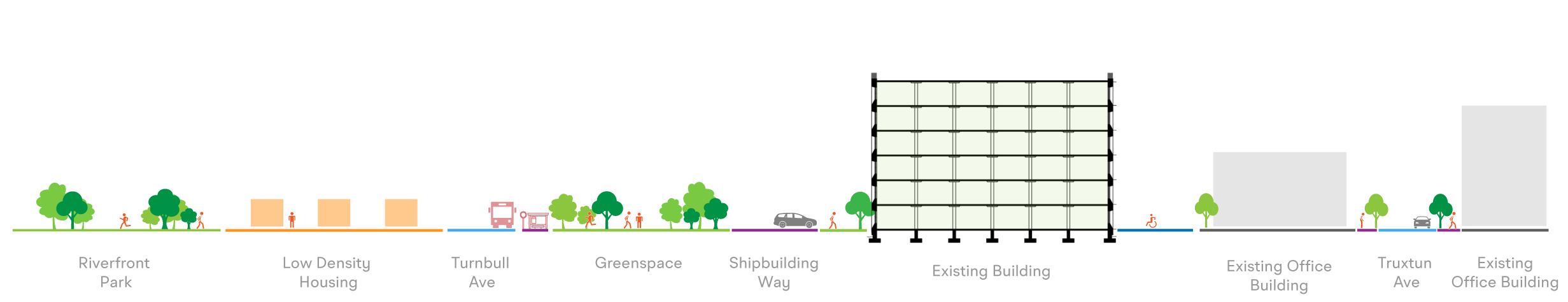 Massing along Noisette Boulevard to incorporate the building into planned street front development