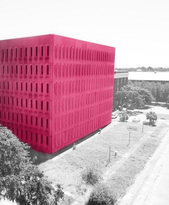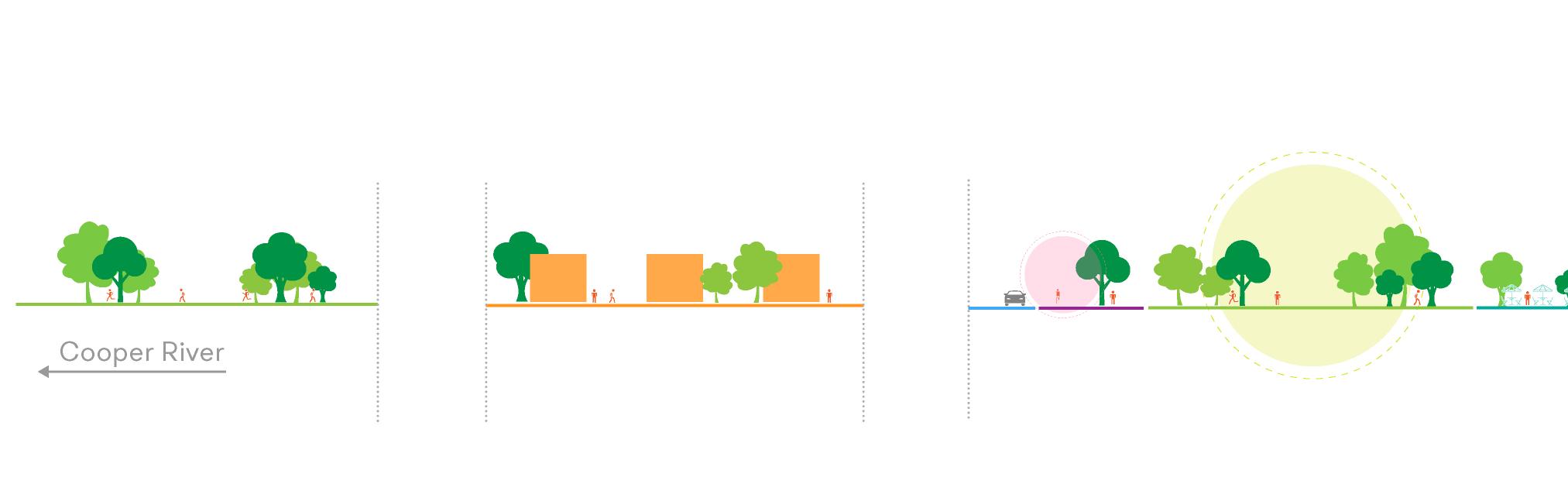 The adaptation of the existing Army Corps of Engineers Building seeks to create a continuous street front, anchored by a public, accessible, community space. The first floor is programed as an ecological library and research facility, housing labs, study rooms, a lecture hall, a library space, and three courtyards. Projecting into the current park space is a cafe, luring the public outward toward the reprogrammed park. The park circulation is adapted for the new building massing. A new “greenhouse” inspired bus terminal continues the Noisette Boulevard corridor and connects users to the broader community. Large public porches and gracious overhangs are intended to invite the public and signify entry points.