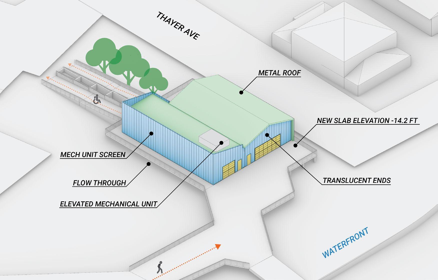 Base form elevated to minimize disturbance of existing public park and to protect against potential flooding