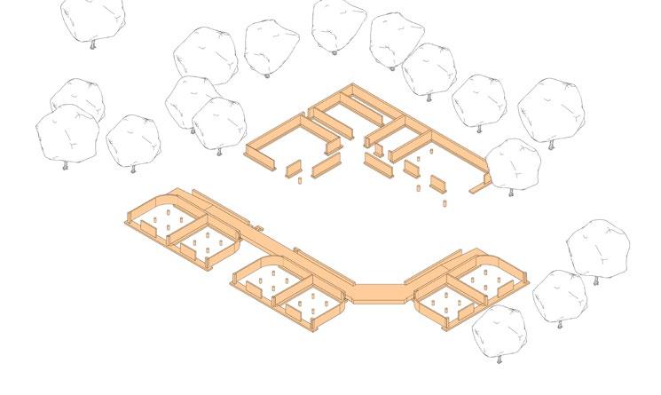 Programs are represented formally, with the creation wing being slightly angled, while the display space maintains a horizontal, processional, linearity
