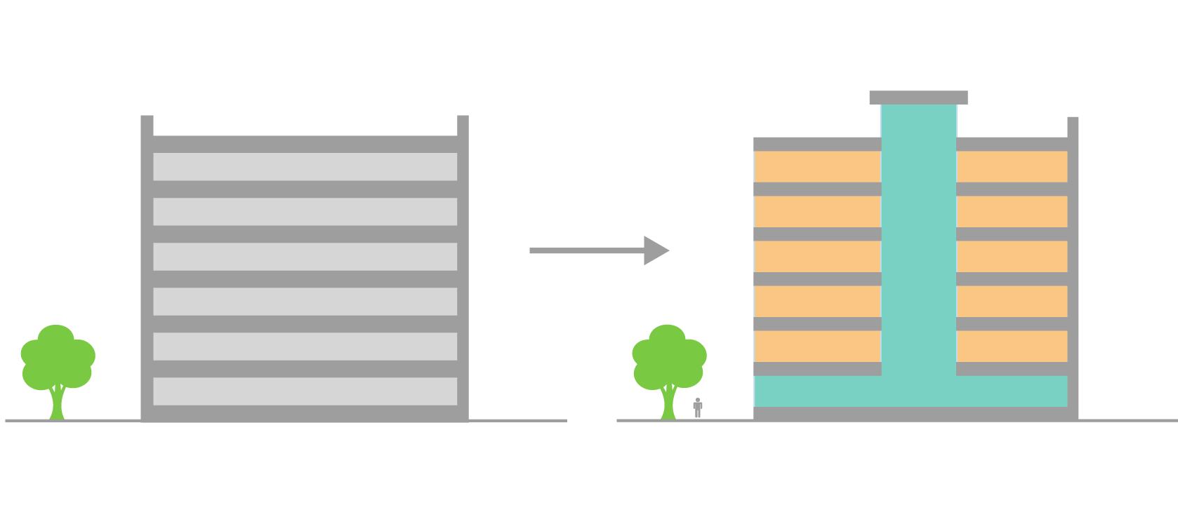 The building core is removed to create a naturally lit public space. The first floor is re-purposed as an Ecology Library and Research space. A cafe is used to reach out into the green space to further integrate building and park. Floors 2-6 are adapted to living spaces and shared outdoor terraces. The southern service entrance becomes an accessible entrance and parking.