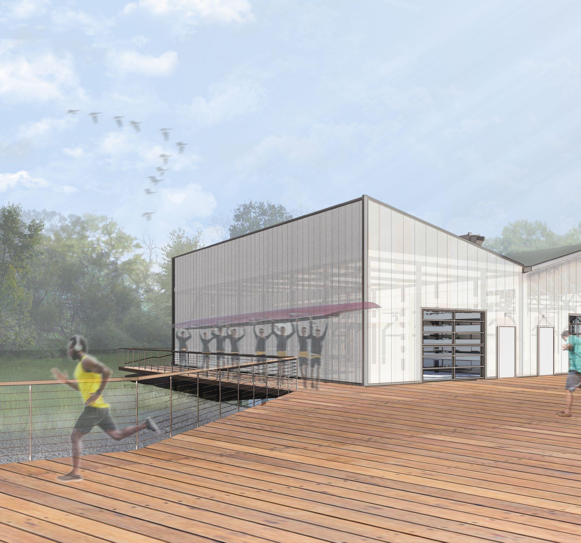 Revitalization of a community building within a larger municipal park redevelopment scheme. The architecture seeks to coexist harmoniously within its riverside residential context, while providing public access to waterfront recreation. This project acts a coming together of critical natural amenities and large portions of low density residential neighborhoods. Opacity of materials is utilized to optimize lighting conditions. Due to the large amount of translucent panels, the project emits light outward during the night, acting as a beacon for the community.