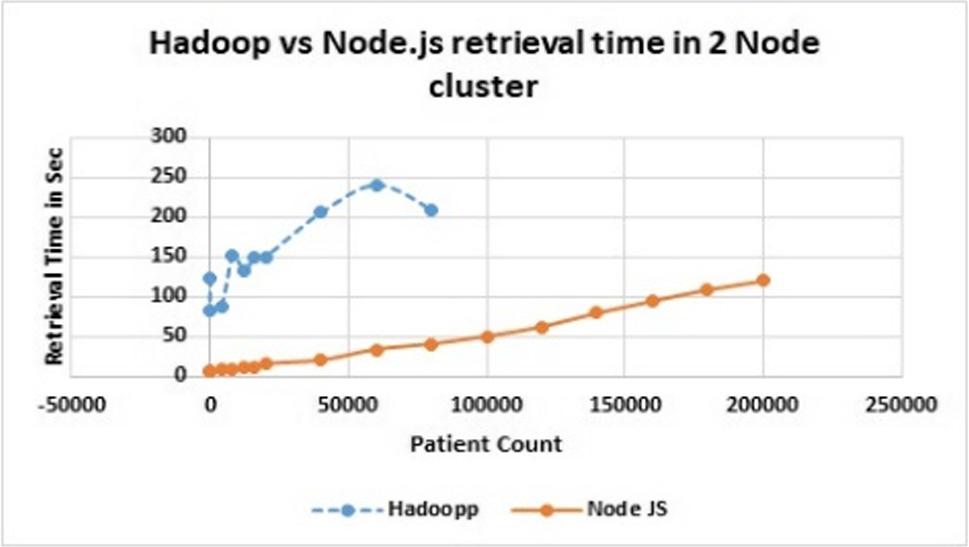 6.2.1Discussion Astheexperimentshavebeenconductedstartingfromlowvolumeofdata,inasinglenodecluster,thenodestopsrespondingwhenwestartincreasingthedatavolume.Incase ofHadoop/HDFS,aClusterunitgetsdownwhennumberofpatientrecordscrosses40 thousand(size531MB).ButwhenanodeclusteristestedwithNGMRfile-system,it workswithmorethan2Lakhs20thousand(2.92GB)dataasshownFig. 15.Incaseof twonodecluster,withHDFSwehavebeenabletoexecutethequerywith80thousand (1.1GB)records,butwithNGMRfilesystem,thepatientcountcanbeincreasedupto morethan2LakhsFig. 16.Thisway,ithasbeenobservedthatourdevelopedNGMR filesystemhasalwaysbeenabletouploaddatainhighervolumecomparedtoHadoop HDFSwithinthesametimeduration.TheresultsareshowninFigs. 17, 18 and 19. Hadoopdistributesthedatatoallitsclusternodes,butNGMRnotonlydistributes,but alsotracksalltheblocklocationsusingtwolayerindexingprocess(Fig. 20).