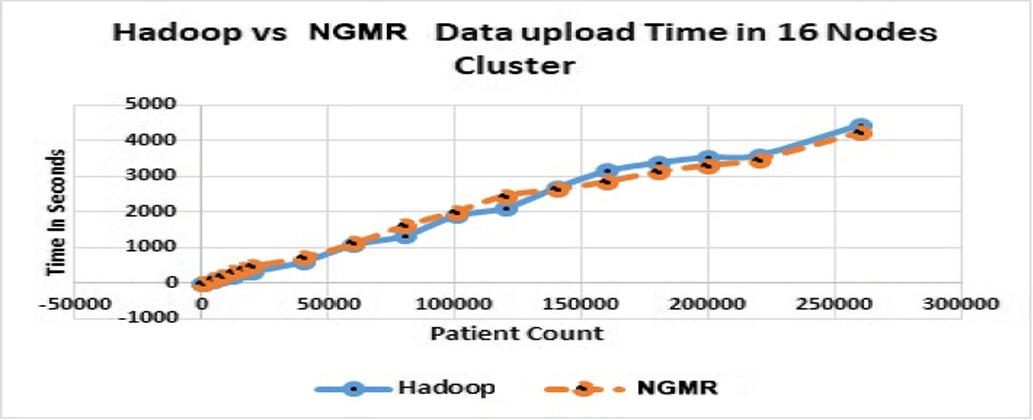 WehavemeasuredthedatauploadingtimeforHDFS,aswellasforNGMRfile system.Wehavegraduallyincreasedthefilesizefrom10to2.60Lakhsrecordsand clusternodecountfrom1to16.Whennumberofpatientcountislow,theuploading timeinNGMRfilesystemisslightlyhigherthanHDFS,askey-wisedivisiontakesplace beforedatadistributionstarts.Butwhenthedatasizeandnumberofnodesincrease,both requirenearlythesameamountoftime.ThedatauploadtimesareshowninFigs. 7, 8, 9, 10, 11 and 12.