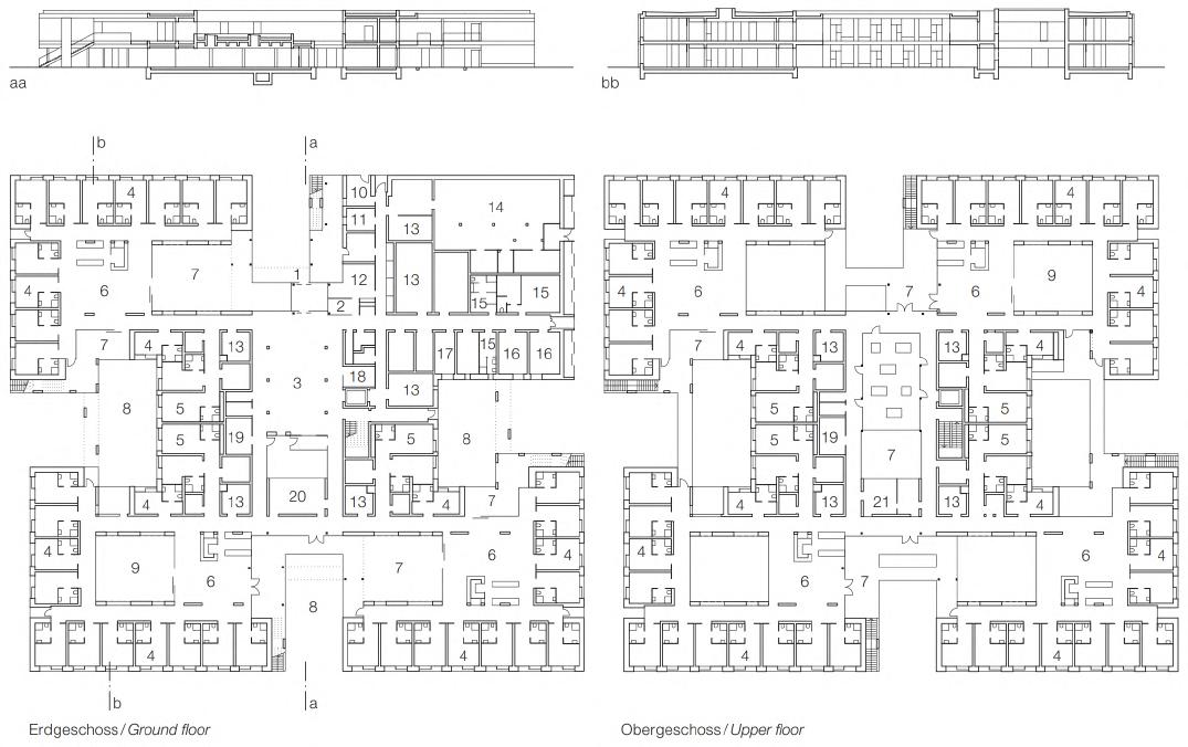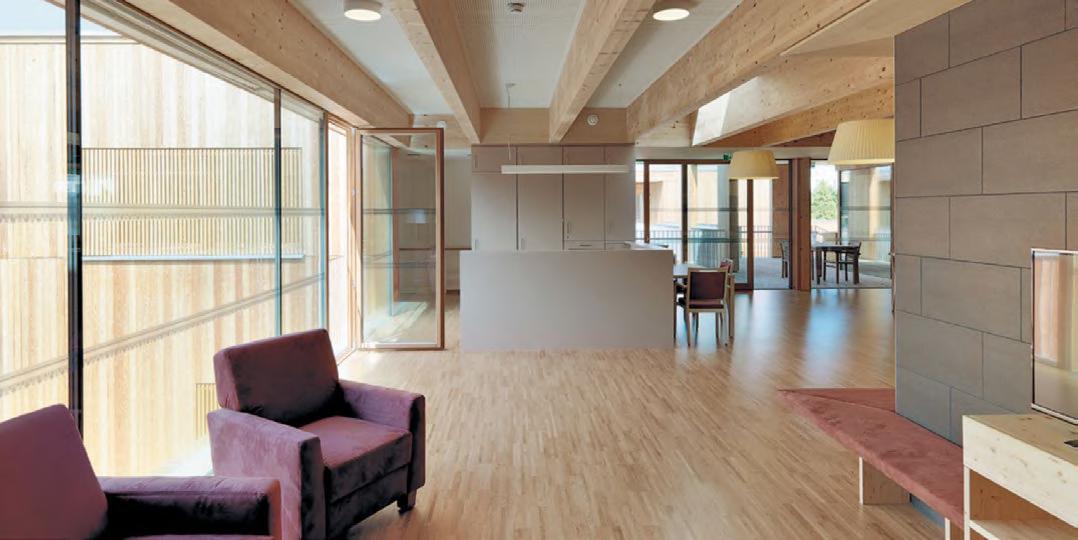The Erika Horn Residential Care Home was designed to provide an environment that resembles a residential community rather than a traditional care facility for the elderly. The primary goal was to create a space where senior citizens could maintain their autonomy and actively participate in daily life. The design incorporates housing communities with large common areas at the center, stimulating a sense of fellowship among residents. The use of wood and rear-ventilated facades is common in the design of old people's homes to create a comfortable and environmentally friendly living space.