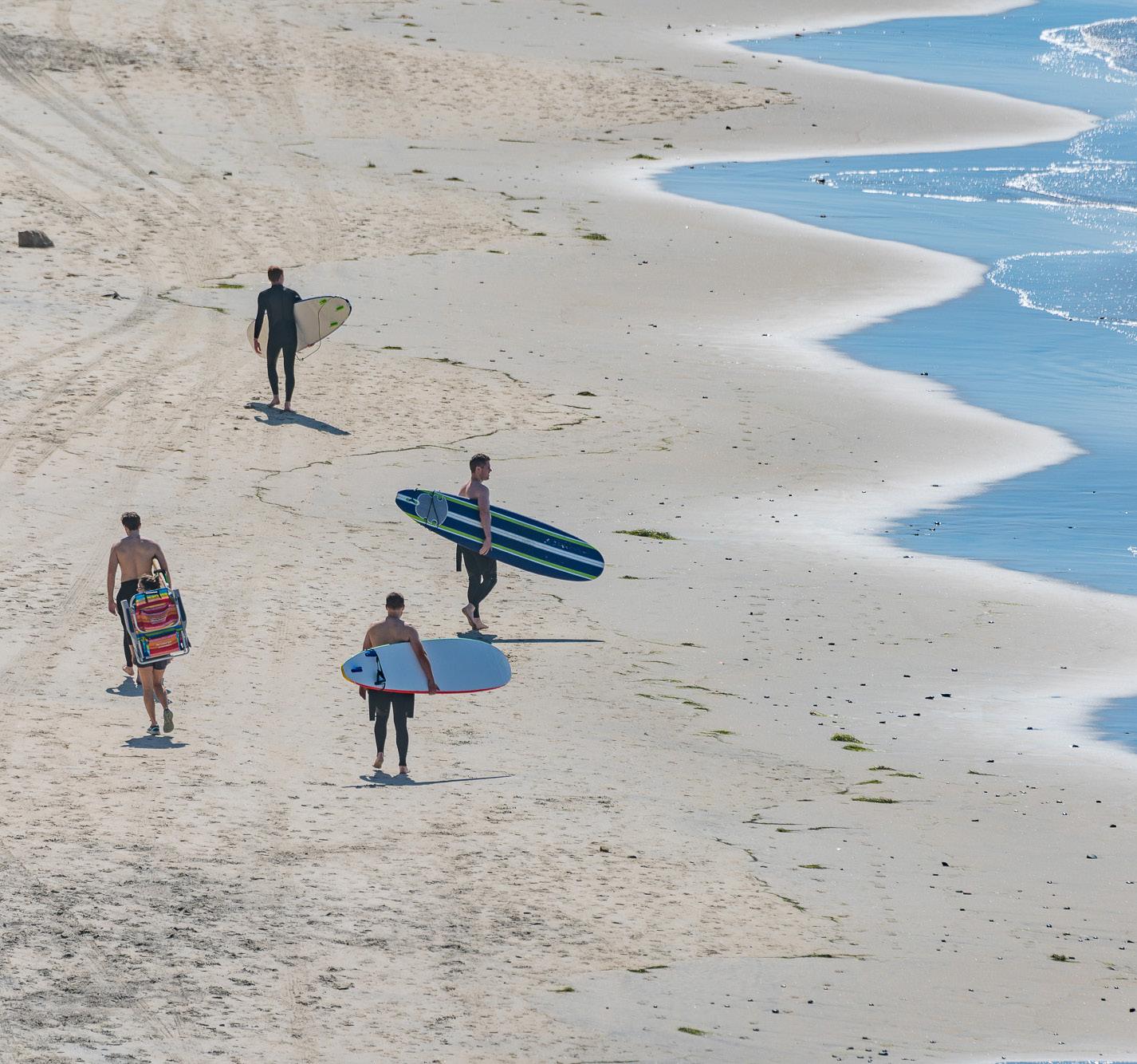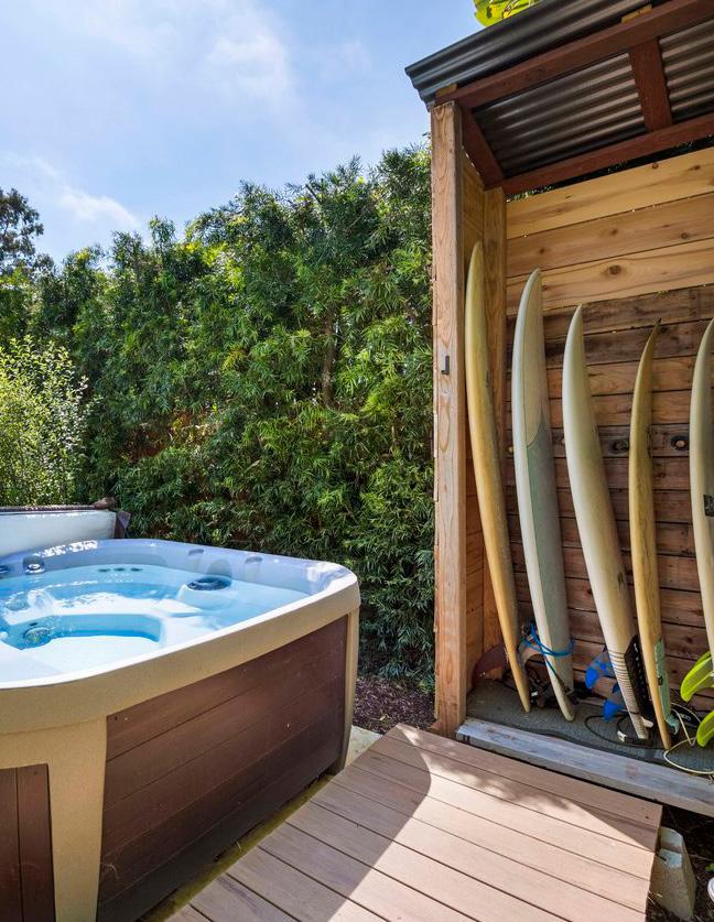 Check all the lifestyle boxes: There’s a spa, outdoor shower and custom surfboard storage. The flexible lower level—featuring a den, bedroom and full bathroom—is an ideal workspace, or can easily be reimagined into a teenage retreat, or a space for extended-stay guests. The two-car finished garage features stone floors, ample storage and a charging station.