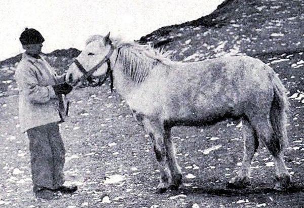 Four Manchurian ponies were selected, with each of the four men on the expedition having their own pony and supply sledge. The ponies were fed on a diet that largely consisted of Maujee, a British military ration consisting of dried beef, carrots, milk, currants and sugar. Occasionally the ponies would also share the scraps from the human plate of seal meat, blubber and fish.