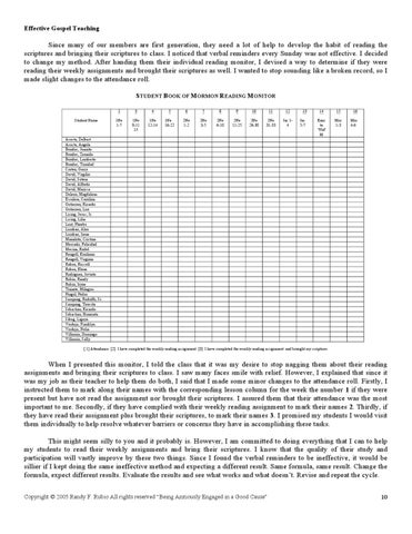 When I presented this monitor, I told the class that it was my desire to stop nagging them about their reading assignments and bringing their scriptures to class. I saw many faces smile with relief. However, I explained that since it was my job as their teacher to help them do both, I said that I made some minor changes to the attendance roll. Firstly, I instructed them to mark along their names with the corresponding lesson column for the week the number 1 if they were present but have not read the assignment nor brought their scriptures. I assured them that their attendance was the most important to me. Secondly, if they have complied with their weekly reading assignment to mark their names 2. Thirdly, if they have read their assignment plus brought their scriptures, to mark their names 3. I promised my students I would visit them individually to help resolve whatever barriers or concerns they have in accomplishing these tasks. This might seem silly to you and it probably is. However, I am committed to doing everything that I can to help my students to read their weekly assignments and bring their scriptures. I know that the quality of their study and participation will vastly improve by these two things. Since I found the verbal reminders to be ineffective, it would be sillier if I kept doing the same ineffective method and expecting a different result. Same formula, same result. Change the formula, expect different results. Evaluate the results and see what works and what doesn’t. Revise and repeat the cycle. Copyright © 2005 Randy F. Rubio All rights reserved “Being Anxiously Engaged in a Good Cause”