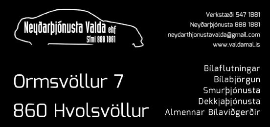 Opnunardagar í mars: Sími 570 9211 - þegar vel er skoðaðSkoðunarstöðin á Hvolsvelli 7. til 9. - 14. til 16. 21. til 23. - 27. til 31. Auglýsendur ath. Búkolla verður ekki gefin út í Dimbilviku, það verður engin póstdreifing. Búkolla SólSetur ehf Útfararþjónusta í Rangárþingi stofnuð 1999 Framleiðum vistvænar kistur og leiðiskrossa. Kristinn Garðarsson - Ártúni 1, 850 Hella Sími 487 5980 & 860 2802 Vélsópun - Stíflulosun Lagnamyndun - Dæling 892-2136