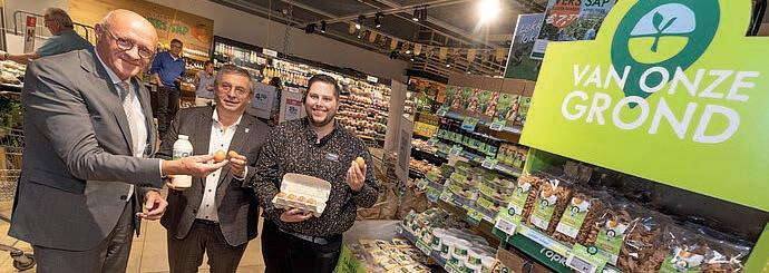 Met een bezoek aan Jumbo Groenendijk in Barneveld markeerden wethouders Bennie Wijnne (Barneveld) en Gerard van Deelen (Scherpenzeel) namens Regio Foodvalley op vrijdag 10 oktober de formele aftrap voor de regionale uitrol van Van Onze Grond in de regio Foodvalley. Het initiatief dat lokale producten van boeren rechtstreeks in de supermarkt brengt met een eerlijke prijs voor producent, supermarkt en consument.